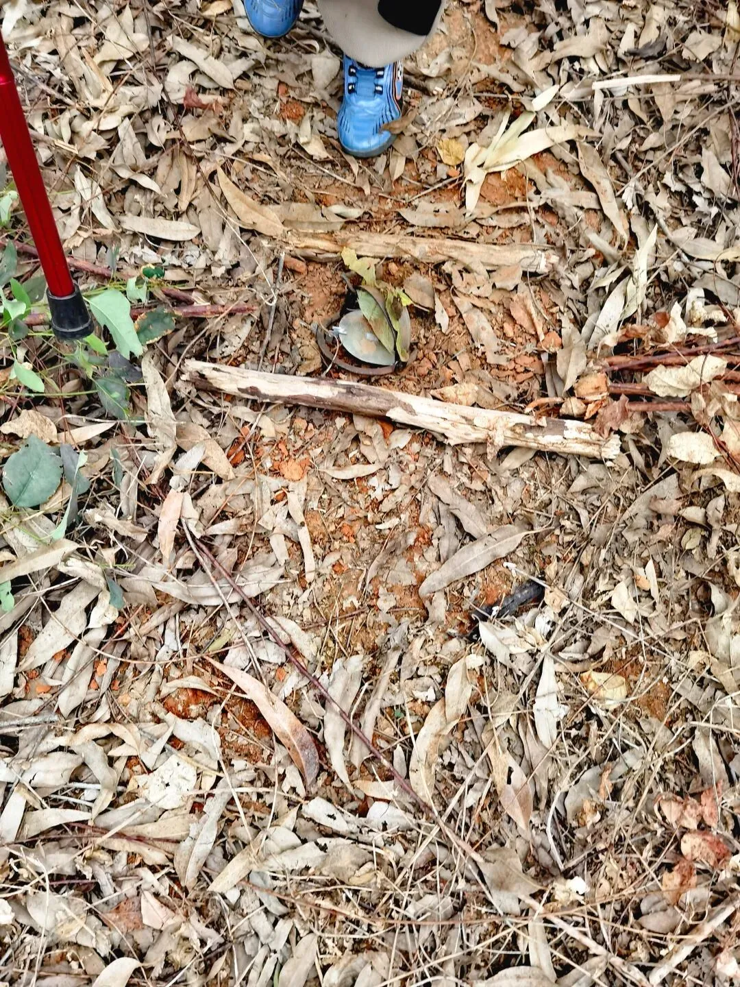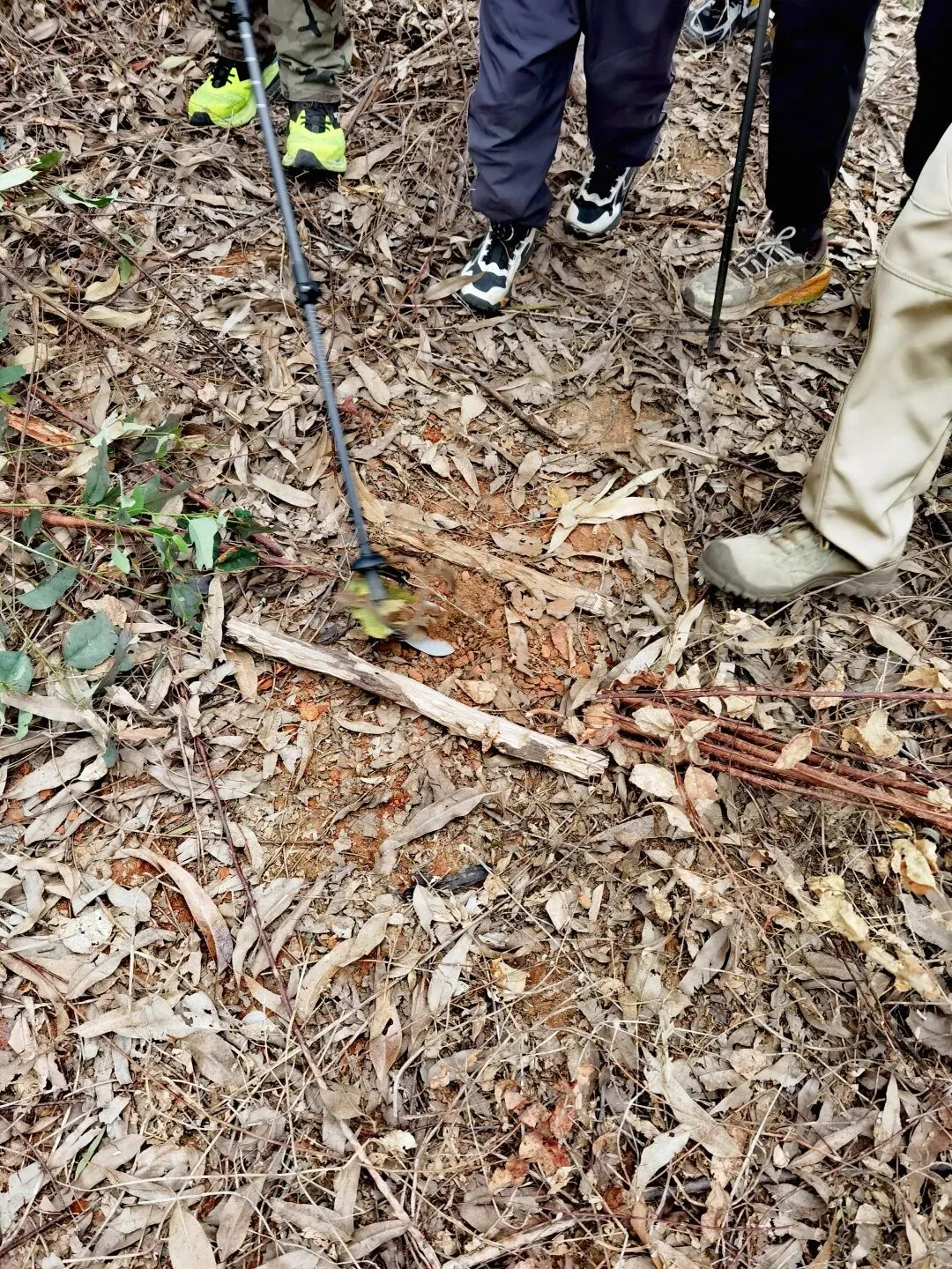 重点提醒!别被桉树林的静谧骗了!离开水库穿越另一片桉树林,我们意外发现了暗藏的危机——宽阔的路中间竟然埋伏着捕鼠夹!捕鼠夹被土和枯树叶掩盖,两根树枝围起做标记,还好队员眼尖及时发现,立刻互相提醒“小心脚下”!同一个路段,连续发现了两个捕鼠夹,还好是白天,晚上去夜徒的注意啊!这场猝不及防的小插曲,也给大家提了个醒:山野徒步,再惬意也要盯紧脚下。