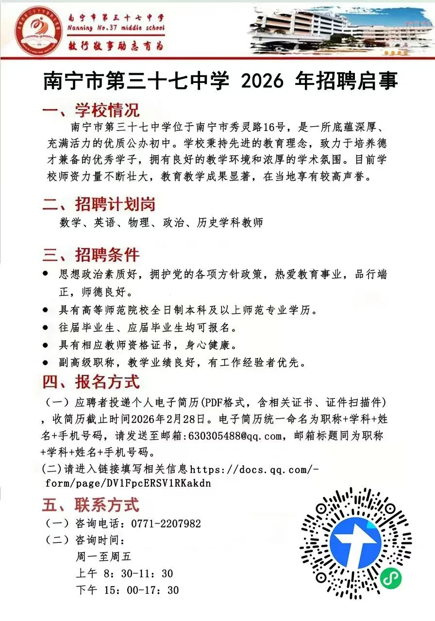 最新招聘:2026年01月30日更新南宁市20所学校教师招聘公告