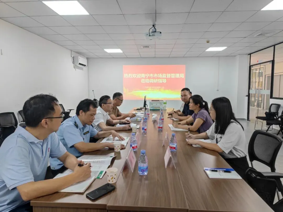 为切实助企纾困、激发市场主体活力,2025年6月4日,南宁市市场监督管理局调研员陈刚毅、科长梁锋、副科长万时民、经开分局副局长张小龙、股长刘畅一行深入广西南环检测科技有限公司(以下简称“南环检测”)开展专题调研,通过实地走访、座谈交流,现场把脉企业发展难题,精准提供政策指导与帮扶支持,助力企业高质量发展。