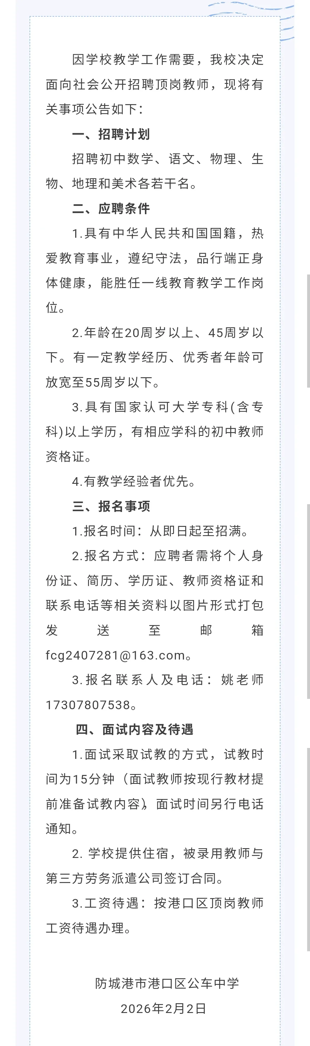 防城港教师招聘:防城港市港口区公车中学招聘