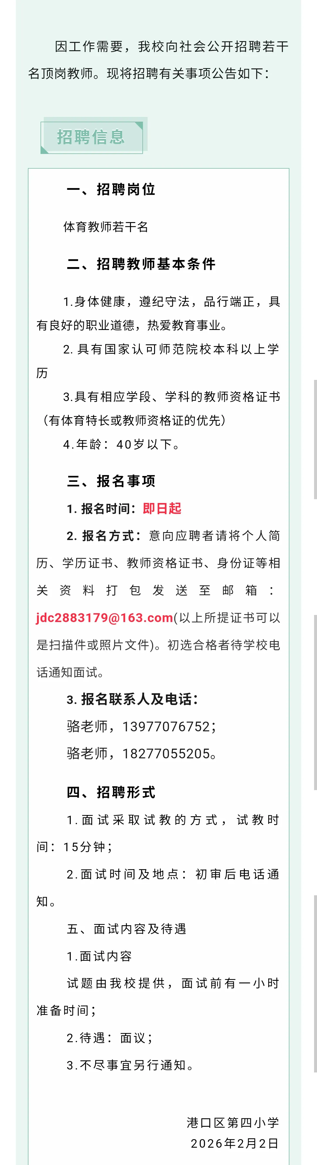 防城港教师招聘:防城港市港口区第四小学招聘