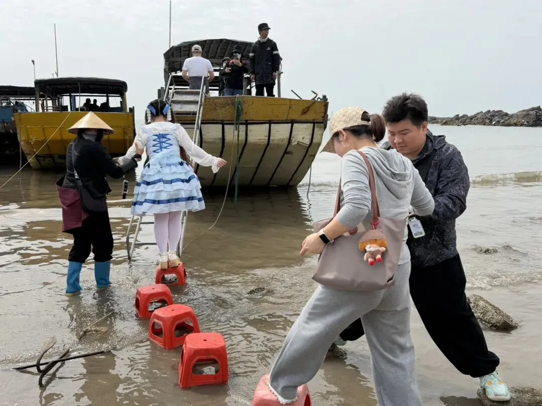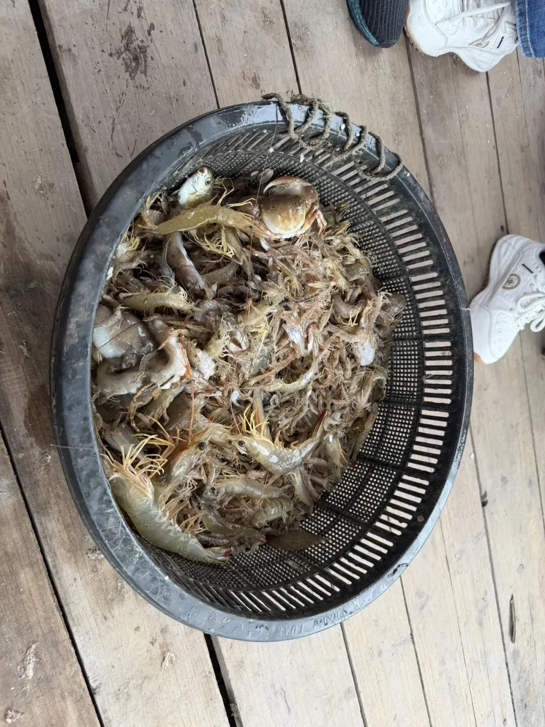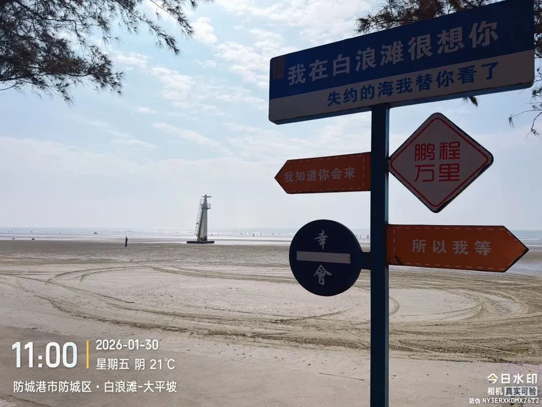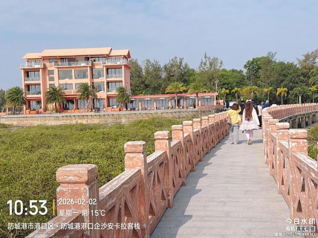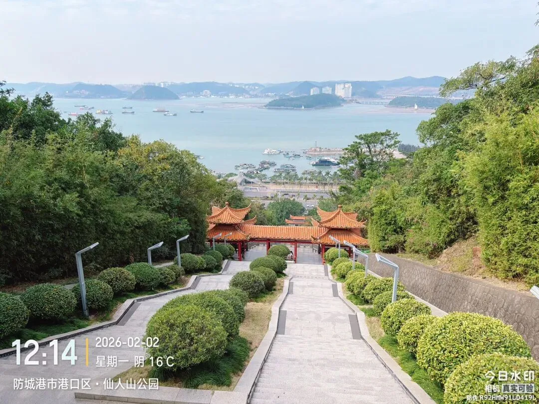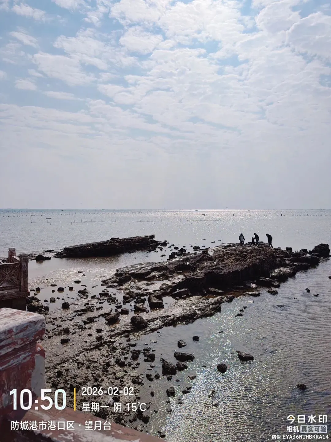 对于在海边城市长大的,这个沙滩并未有什么惊艳的地方,处于淡季人不多,设施也有些陈旧,和想象中的差不多。中午去了白沙湾的一个旅游度假区吃午餐,可能还是季节的原因,游人稀少,地方还是蛮干净的。下午的景点是出海,第一次蛮新鲜的,特别是登船方式,海上蛮颠簸的,晕船人士估计有些考验,加上浓浓的的柴油味,让我不晕船的那位开始有晕船的症状了。260RMB一船的费用,以虾蟹为主,还有一只章鱼,变成了晚上加餐的2份海鲜,性价比还是有的。上午去看红树林公园,并且科普了中华鲎的栖息地,一路上东北的大妈大爷很多,气候宜人,节奏很慢,适合养老。下午去了十万大山布透温泉,抱着来都来了的心态泡了温泉,但是储物箱租用比较坑,写着免费,实际上30元的费用,退到银行卡貌似都没收到,看后期是否收得到。晚上海鲜市场+市场楼上加工,新鲜海鲜吃到饱。连续2晚同一个包厢,点了不同海鲜,价格还是有优势的,皮皮虾带膏和不带膏差价很大。2026.02.01 第四天万尾金滩,G219国道0公里起点东兴和越南边境线,隔着河可以看到越南,在这里时间充分的话可以去越南玩上一天。万尾金滩景区,邂逅了寄居蟹,还有女儿裙子上蝴蝶的依依不舍,漂亮的裙子也吸引蝴蝶🦋。冬季人不多,景区开发也不是很商业化,总体旅游时间不会占用很多,走了一圈。仙人山公园是防城港的最高点,600多级台阶,登仙人阁最高层,一览防城港风貌还是值得的。下午的海钓还是值得尝试的,我和老婆女儿人生第一次海钓,去海钓平台的码头是一个在建码头,需要踩着碎石登船,乘小船抵达海钓平台后,开始了一下午的海钓,女儿是本次海钓的冠军,钓了约7条鱼,我3条,老婆1条🐟,收获满满。