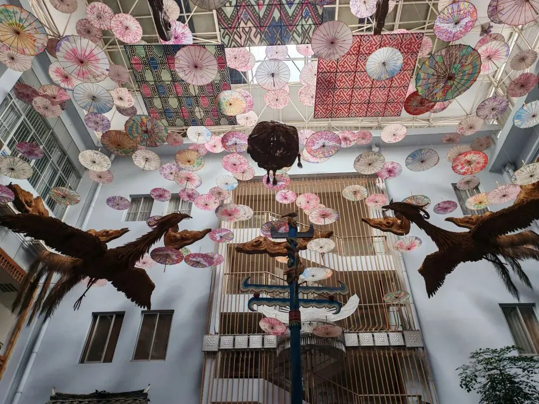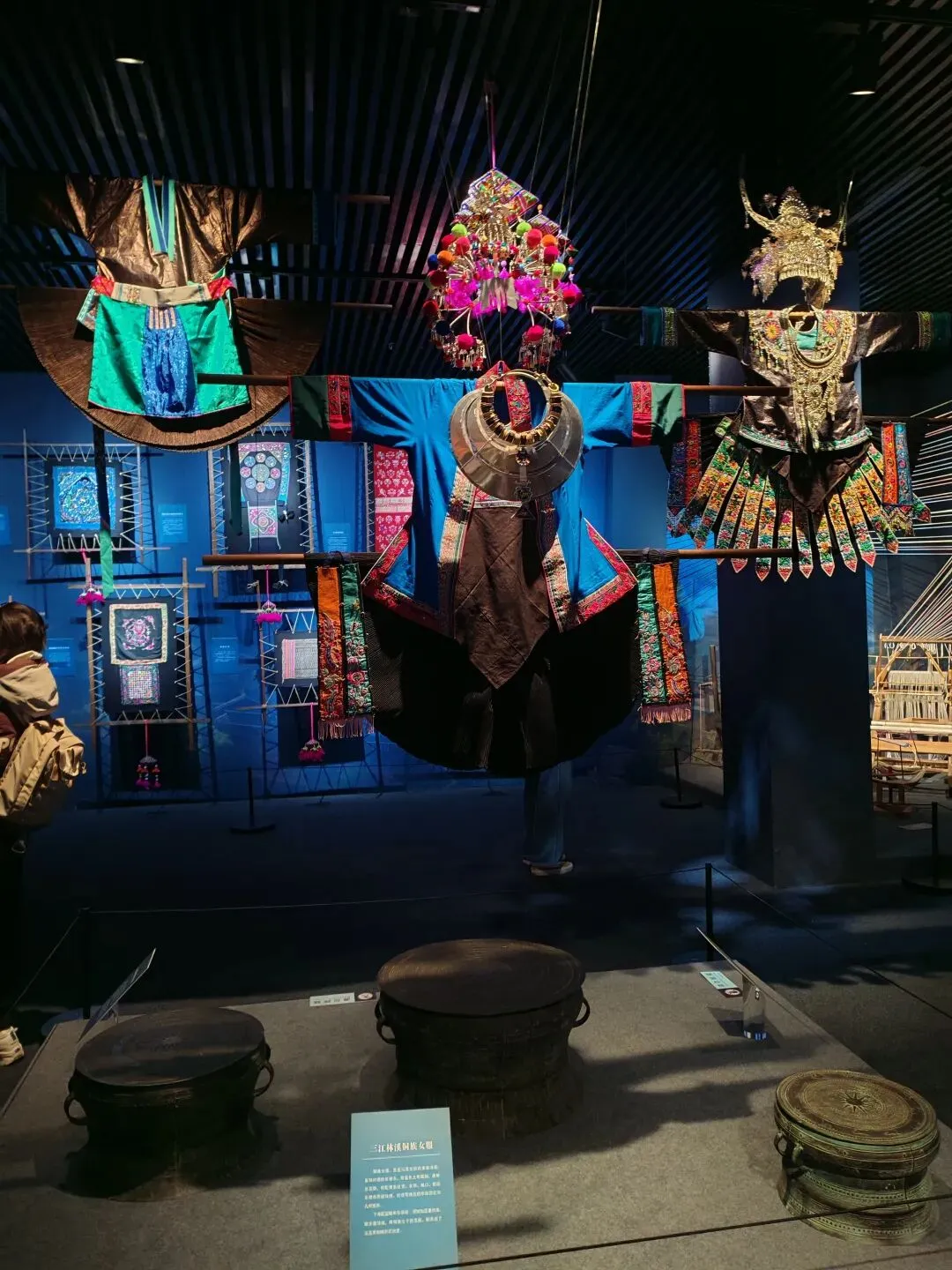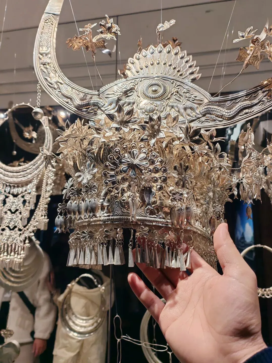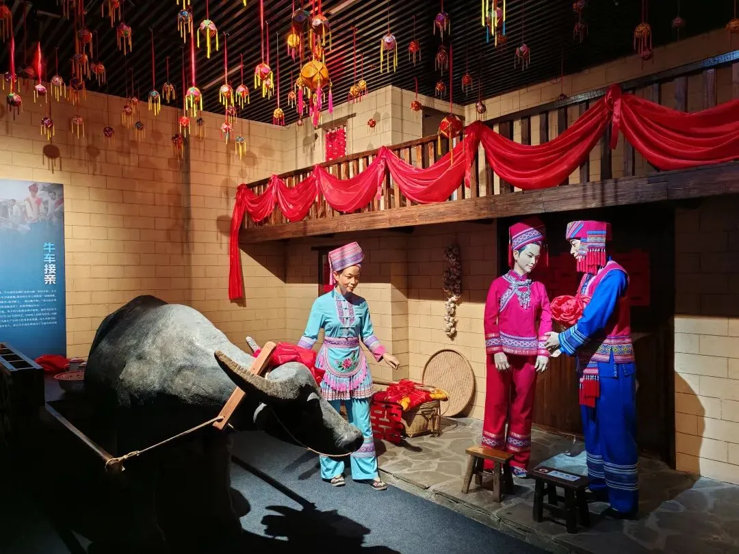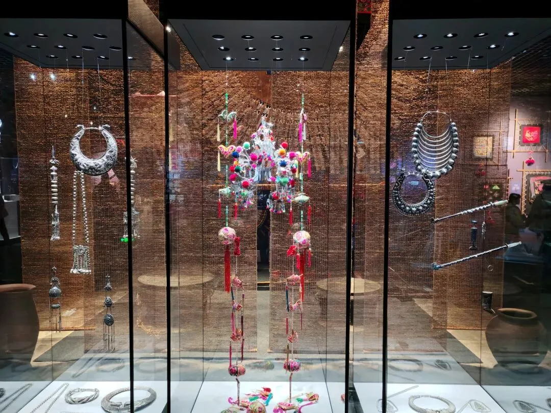 在民族展厅里,苗族银饰在灯光下泛着冷光,壮族织锦的凤凰图案栩栩如生。