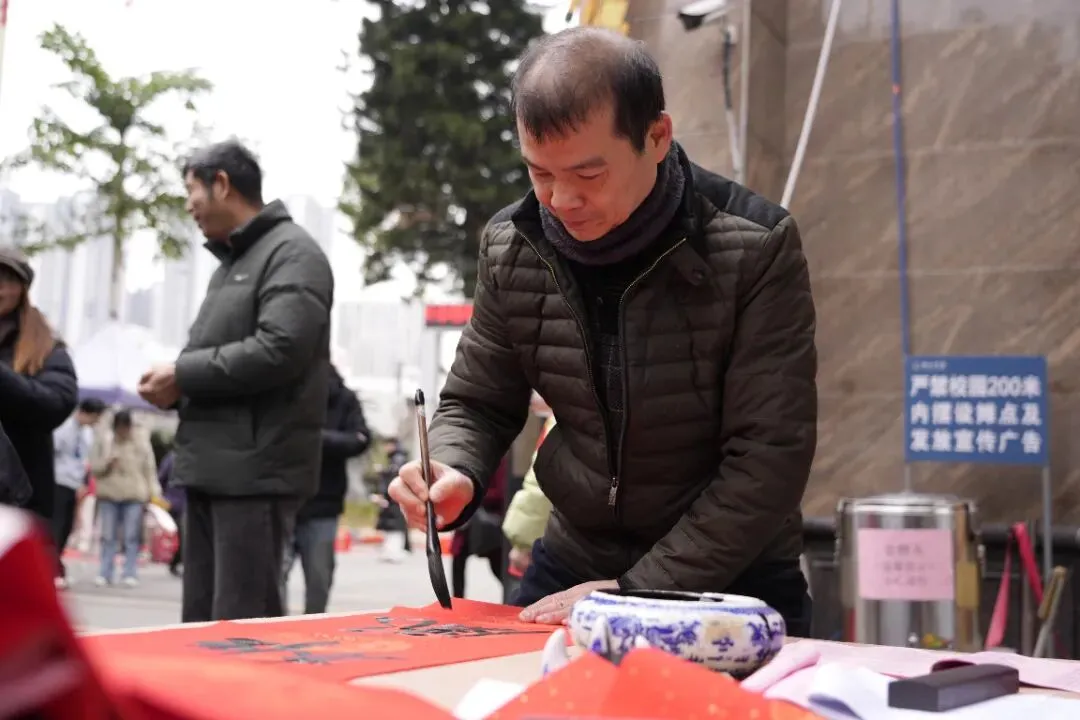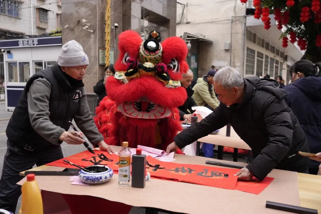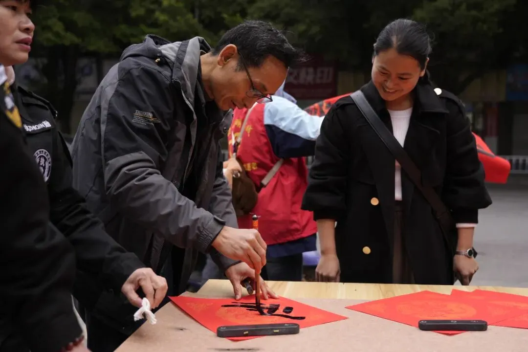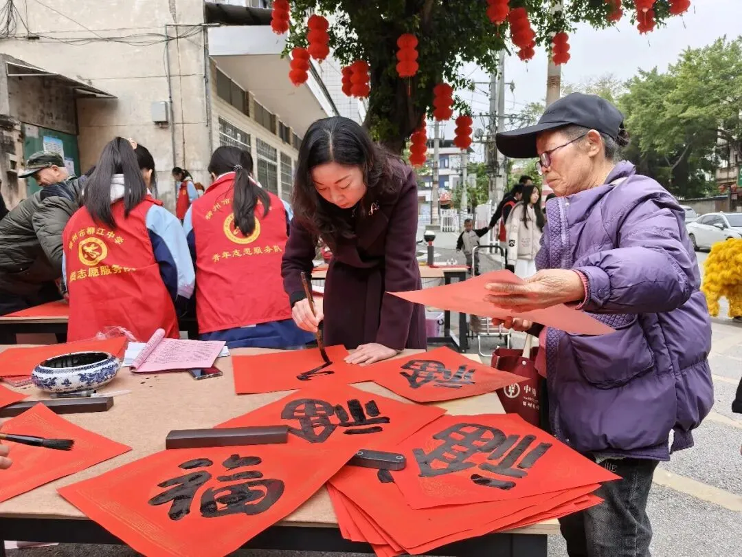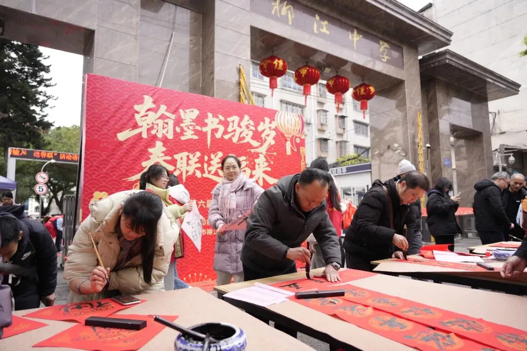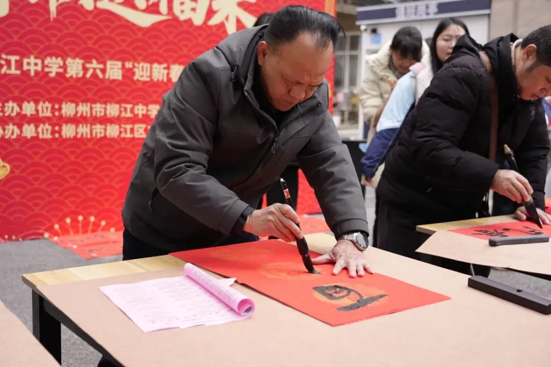 活动现场热闹非凡,红灯笼装点下的场地年味十足。校内师生、书法特长家长与柳州市柳江区文学艺术界联合会特邀书法家组成的创作团队,挥毫泼墨、笔走龙蛇。“马到成功添锦绣,春回大地谱新篇”“骏业宏图开景运,福门吉庆纳新春”,一幅幅饱含马年寓意的春联、一个个遒劲有力的福字,在笔尖流淌而出。群众有序挑选、定制心仪的春联,志愿者们忙碌地传递纸笔、包装成品,舞狮队的精彩表演更添喜庆氛围,定格下一个个温馨瞬间。