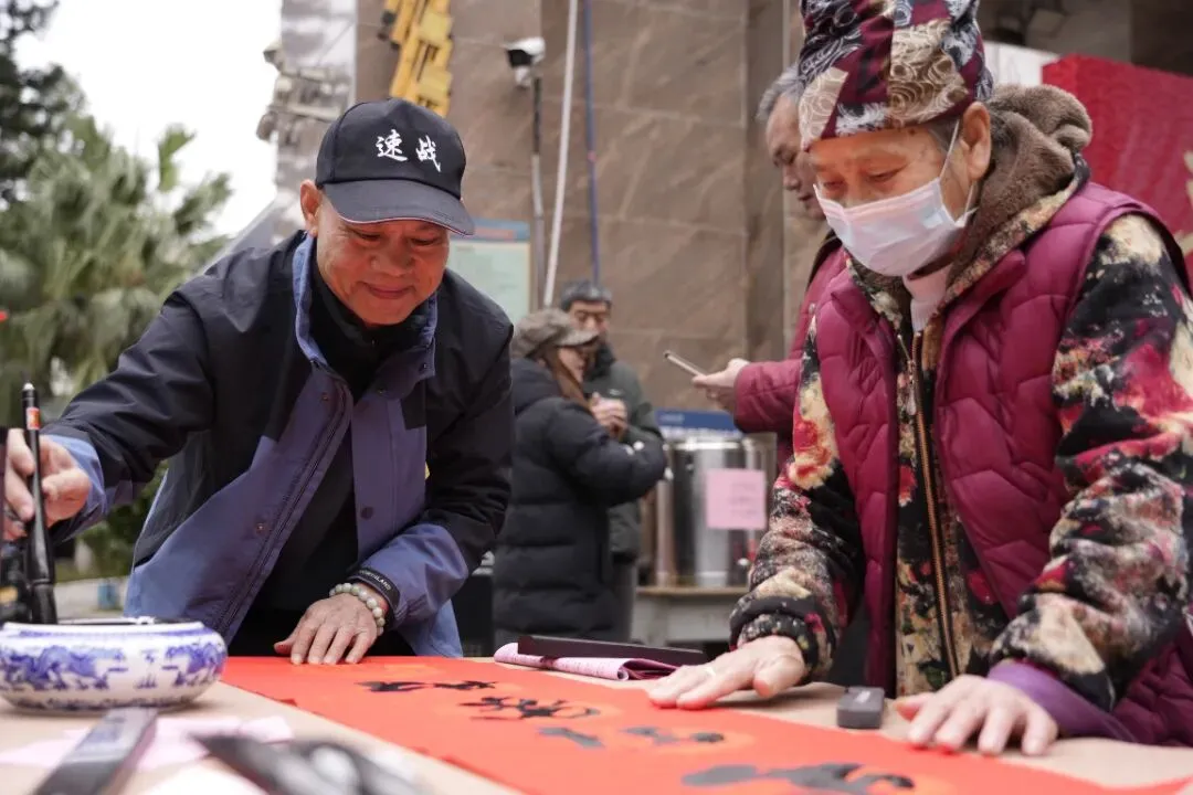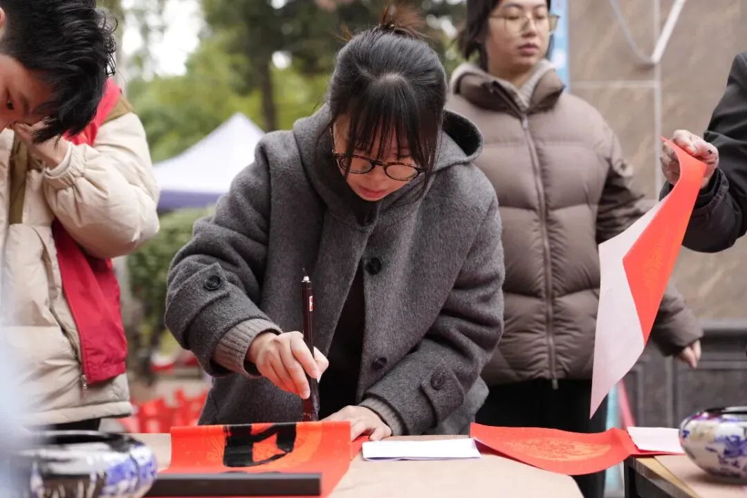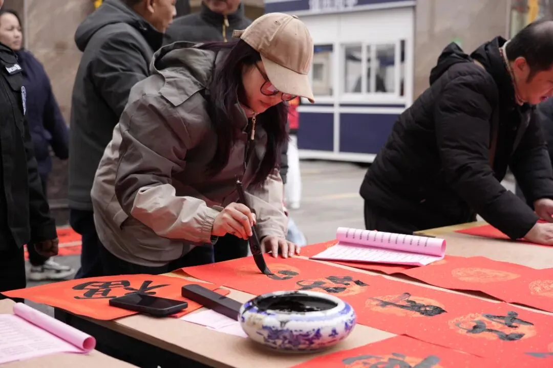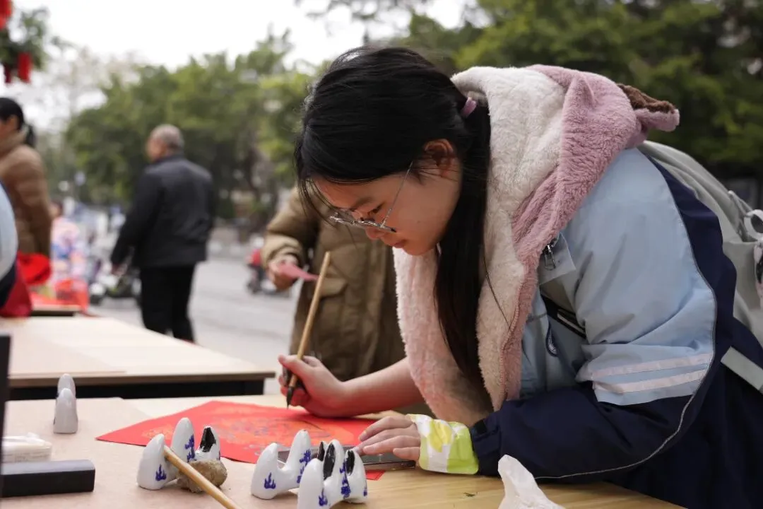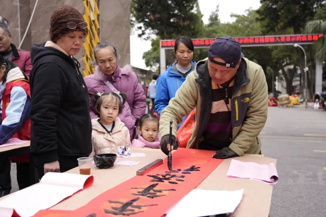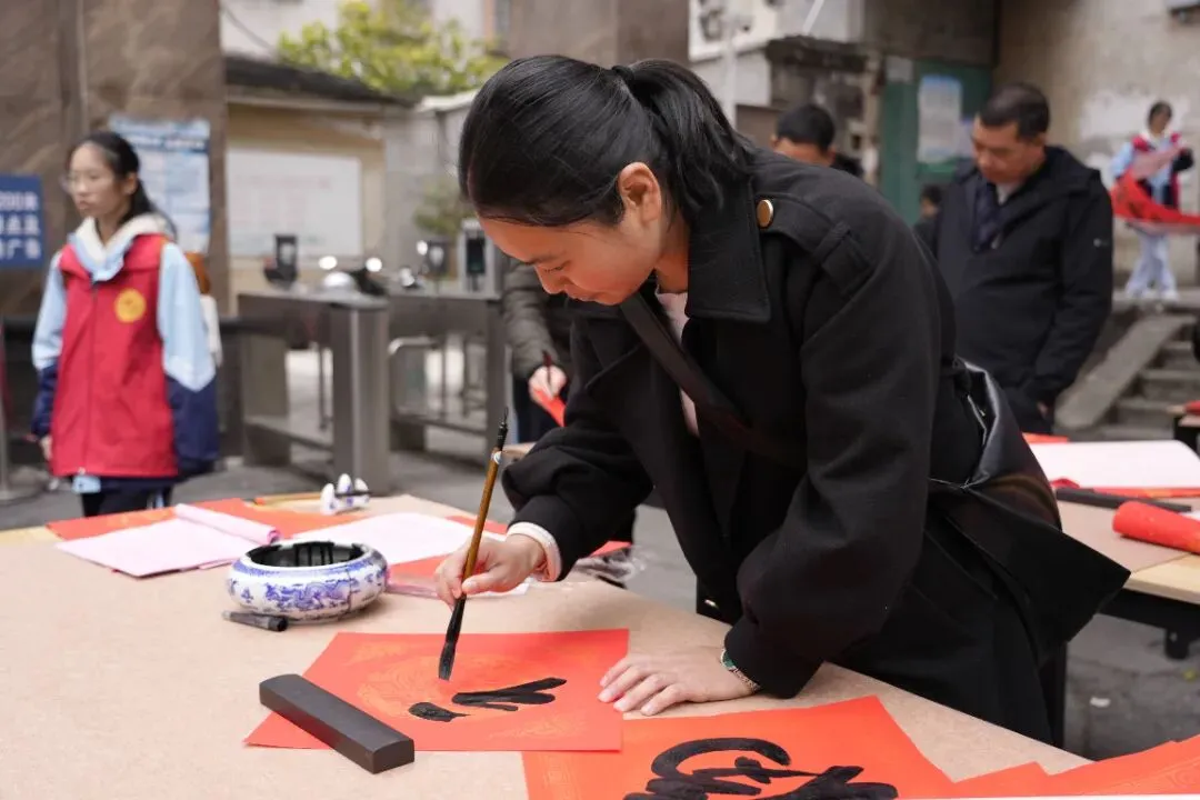 活动现场热闹非凡,红灯笼装点下的场地年味十足。校内师生、书法特长家长与柳州市柳江区文学艺术界联合会特邀书法家组成的创作团队,挥毫泼墨、笔走龙蛇。“马到成功添锦绣,春回大地谱新篇”“骏业宏图开景运,福门吉庆纳新春”,一幅幅饱含马年寓意的春联、一个个遒劲有力的福字,在笔尖流淌而出。群众有序挑选、定制心仪的春联,志愿者们忙碌地传递纸笔、包装成品,舞狮队的精彩表演更添喜庆氛围,定格下一个个温馨瞬间。