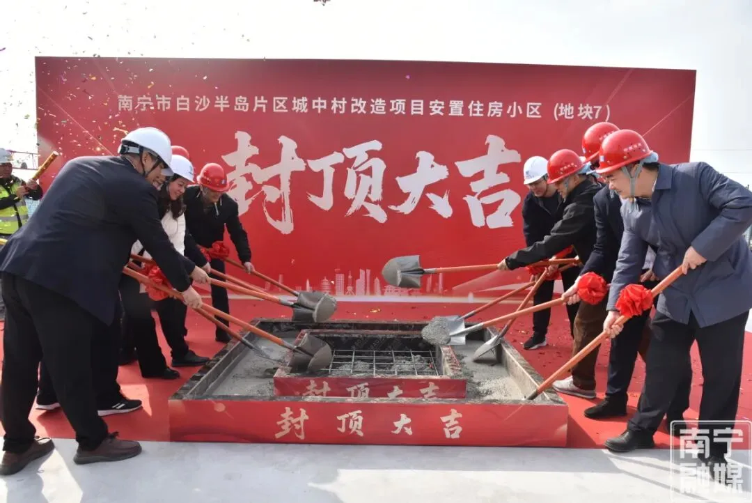 近日,南宁市首批城市更新项目样板工程——白沙半岛片区城中村改造项目安置住房小区(地块七)在1号楼屋面举行封顶仪式。据悉,屋面封顶作为项目建设过程中的关键节点,标志着项目施工取得了阶段性胜利,为后续工程奠定了坚实基础。