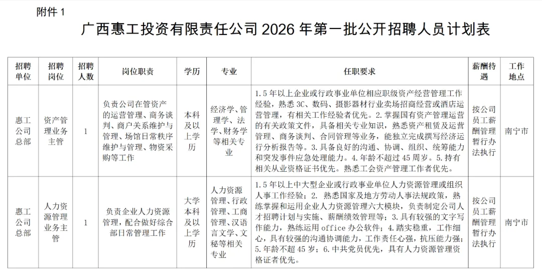 附件1:广西惠工投资有限责任公司2026年第一批公开招聘人员计划表.docx
