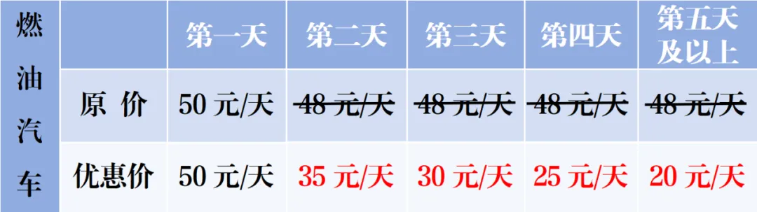 此次优惠活动延长后,燃油车与新能源车差异化优惠政策保持不变:燃油车实行阶梯封顶价,首日(24小时)封顶50元,第五天及以上每日封顶20元;新能源车按原标准半价收费。