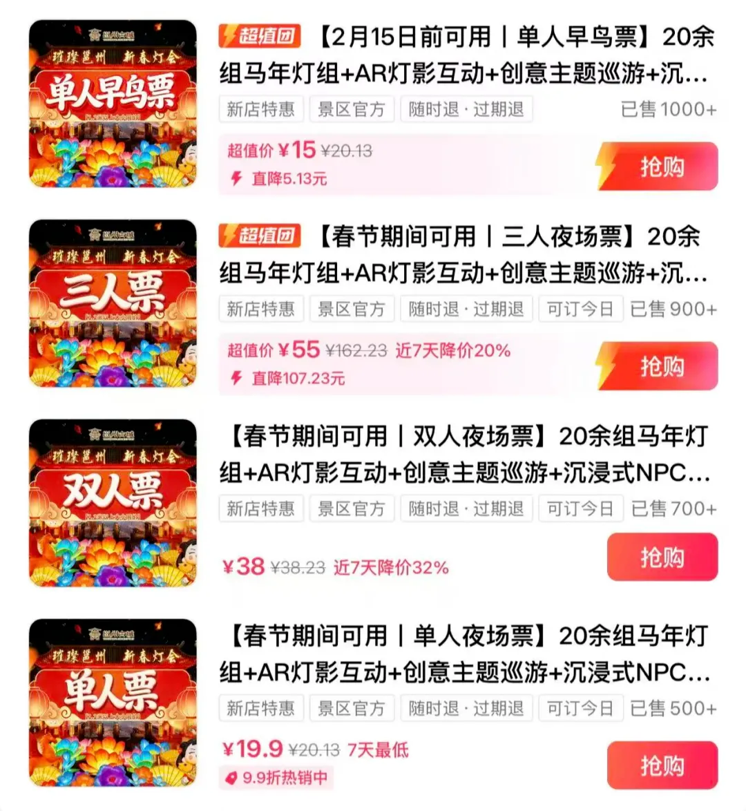 水街灯会的门票从40元/人,到38元/人,再到19.9元/人,再再到7.9元/人,如今是流量也起来了,场子也热闹了。