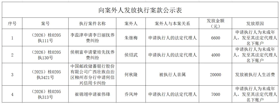 柳州市柳北区人民法院关于向案外人发放执行案款的公示(2026年第7期)