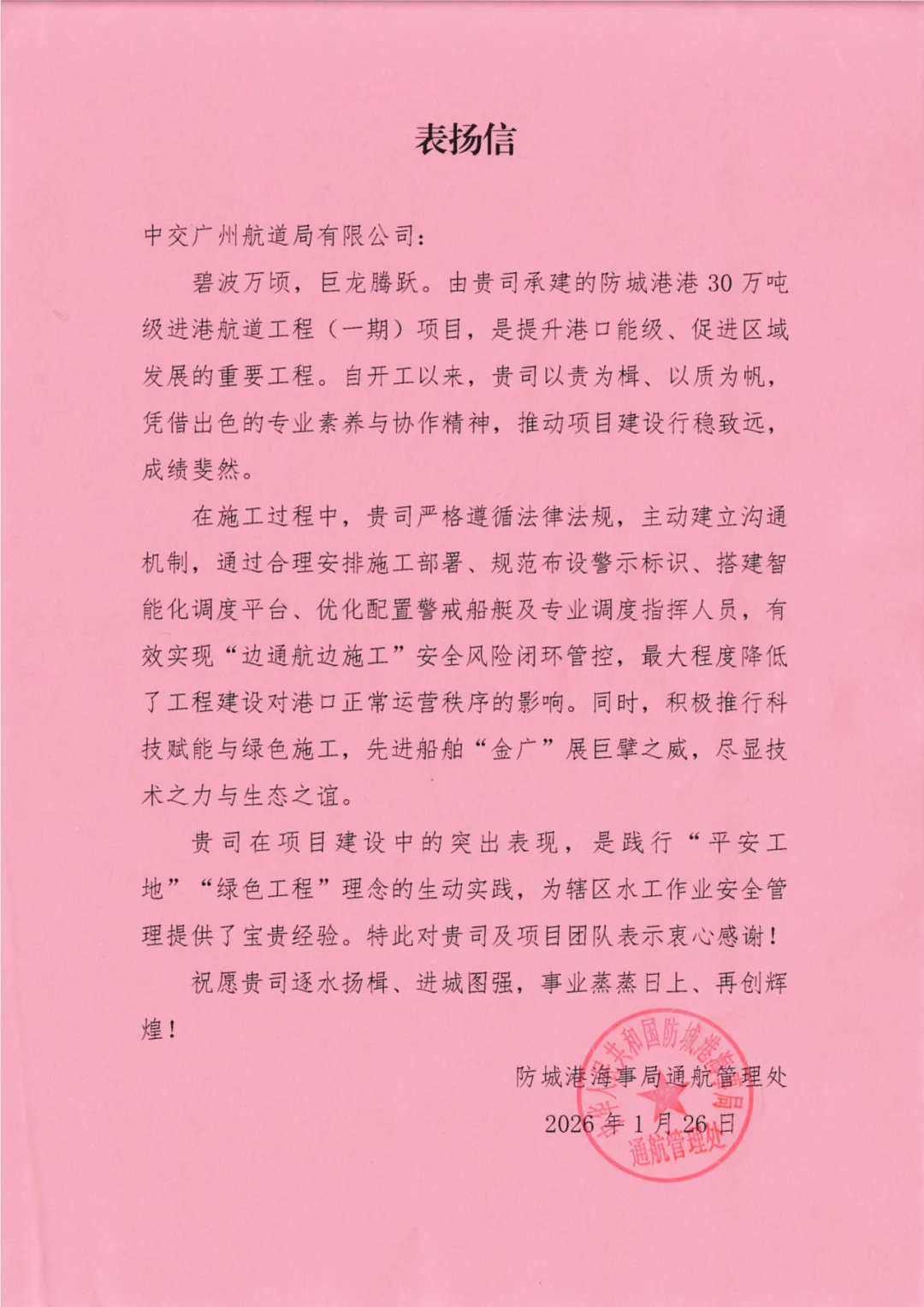 近日,防城港30万吨航道项目部收到防城港海事局通航管理处的表扬信,信中对项目团队在工程建设中展现的专业素养、责任担当与协作精神给予高度认可。