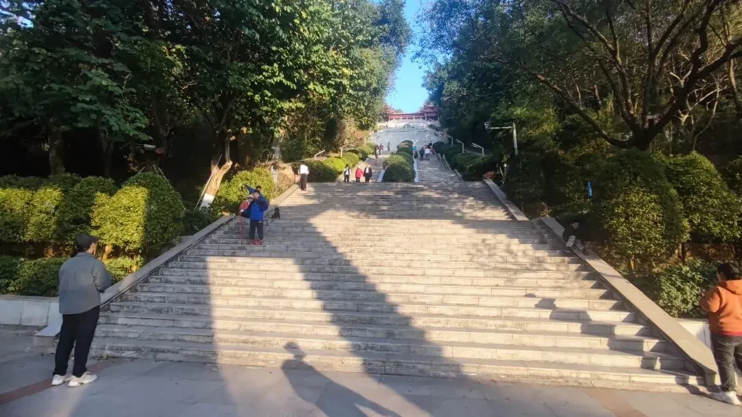 拾级而上,612级石阶蜿蜒攀升,四次停顿的缓台成为途中的文化驿站。每处缓台皆有主题浮雕,或再现伏波将军马援南征交趾的铁血征程,或描绘八仙过海的仙踪逸事,更有壮乡歌舞、耕海犁田等场景,将历史传说与民俗风情镌刻于石。缓台两侧延伸出清幽小径,穿行于大王椰、火焰花等乡土植物间,花香与负氧离子萦绕鼻尖,让人在攀登中忘却疲惫,沉浸于“曲径通幽处”的静谧之美。