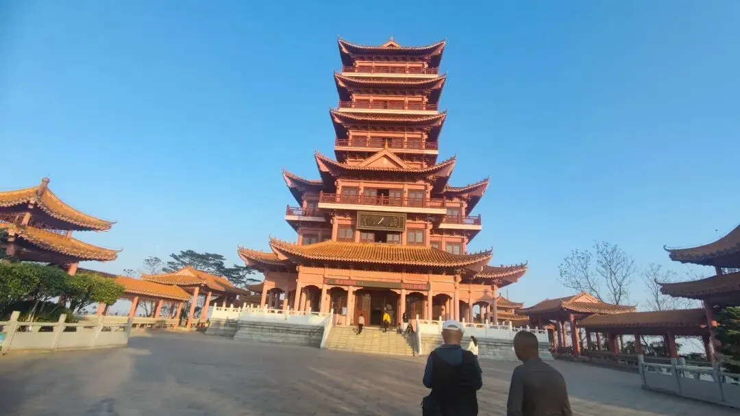 登顶后,开阔的山顶广场豁然开朗。生态停车场方便自驾游客驻足,后侧的活动场地成为市民健身、游人打卡的热门区域,快门声与欢笑声不绝于耳。广场中央,7层仿清式仙人阁巍然矗立,40.68米的高度使其成为俯瞰港城的绝佳据点。此处既是自然景观的交汇点,也是人文气息的聚集地,吕洞宾驾鹤修仙、刘半仙坐化留诗的传说在此流传,为热闹的广场增添了几分空灵仙韵。