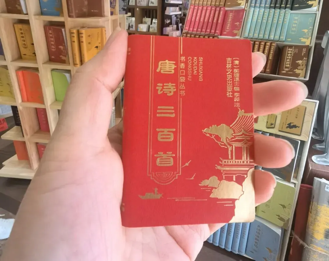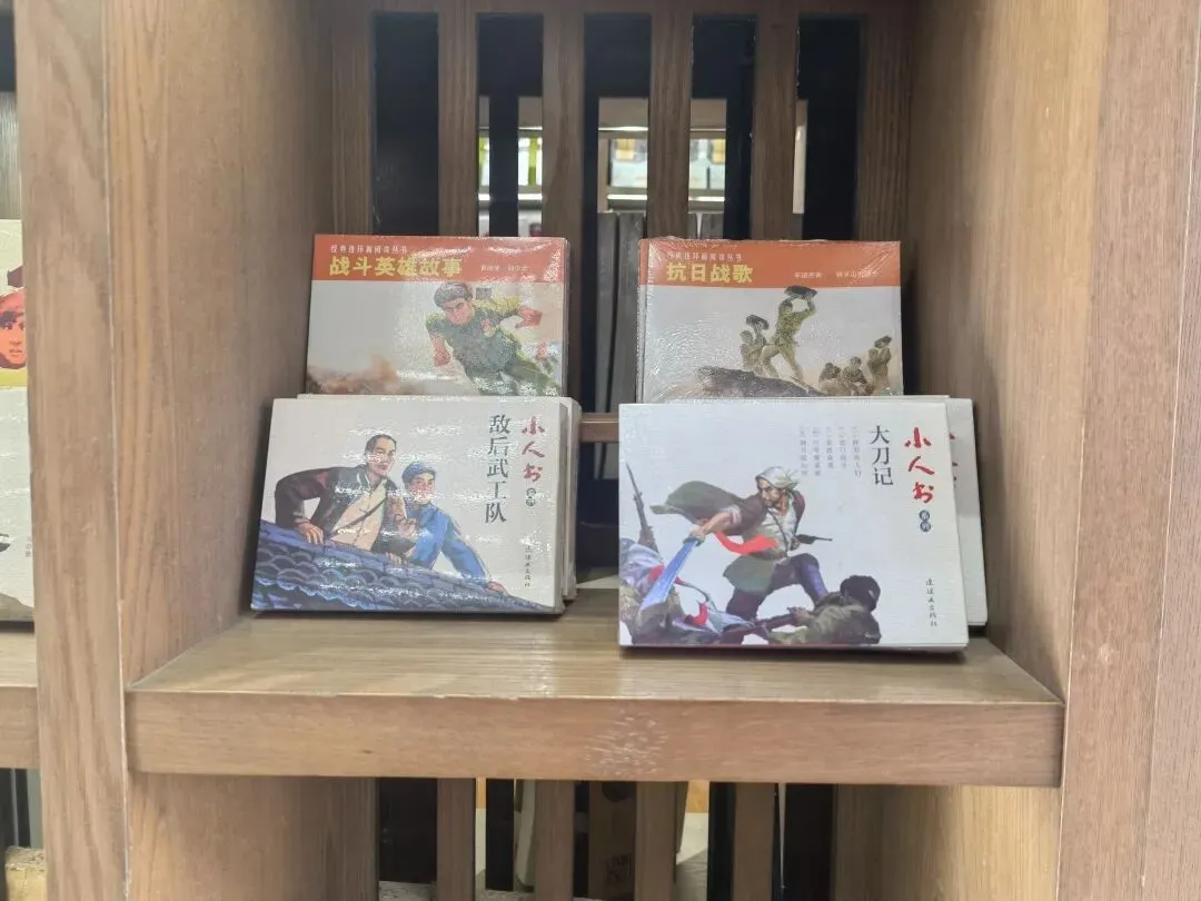 让我欣喜的是,在这里发现了很多小时候常看的小人书,像《敌后武工队》《大刀记》《战斗英雄故事》等。还有小巧玲珑的口袋书《唐诗三百首》《弟子规》等。一面墙上摆设着像中药铺子一样的文字药铺,写着专治心慌、迷茫、精神内耗,两边挂着对联:世间百病,书有解药。对症下书,疗愈人生。