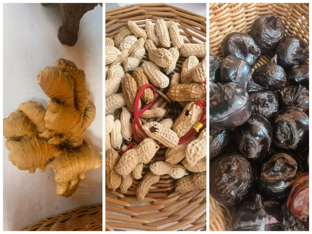 在钟鼓楼四周,正在举办广西乡村工匠年货集市活动。售卖的货品都出自乡村工匠工作室及相关主体。手工盆景、茶叶、木雕、丝绣、醒狮、肉桂文创等种类繁多,令人目不暇接。下图中雕刻出的生姜、马蹄、花生全都惟妙惟肖,足以以假乱真。