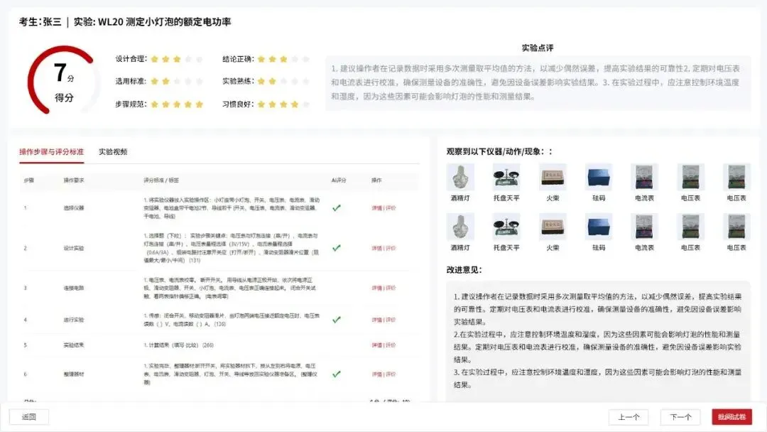 依托人工智能辅助评分系统,实现操作规范性、数据准确性的智能识别,减轻教师负担。