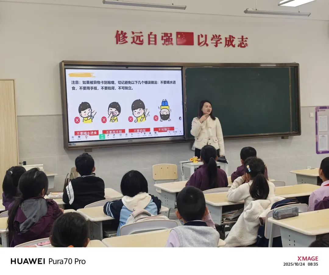 五年级家长为孩子们生动演示了海姆立克急救法。通过实操练习,孩子们掌握了这项关键时刻能挽救生命的宝贵技能,安全意识与救护能力得到切实提升。