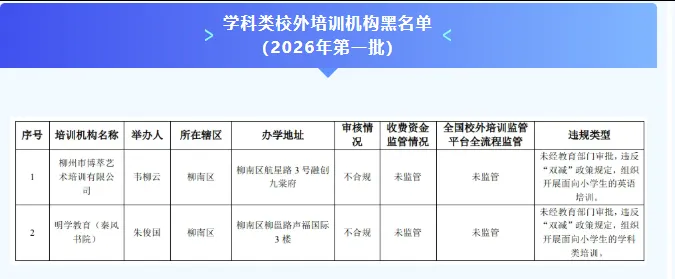 1、柳州市博萃艺术培训有限公司,办学地址:柳南区航星路3号融创九棠府,审核“不合规”,收费资金未监管,违规类型:未经教育部门审批,违反“双减”政策规定,组织开展面向小学生的英语培训;