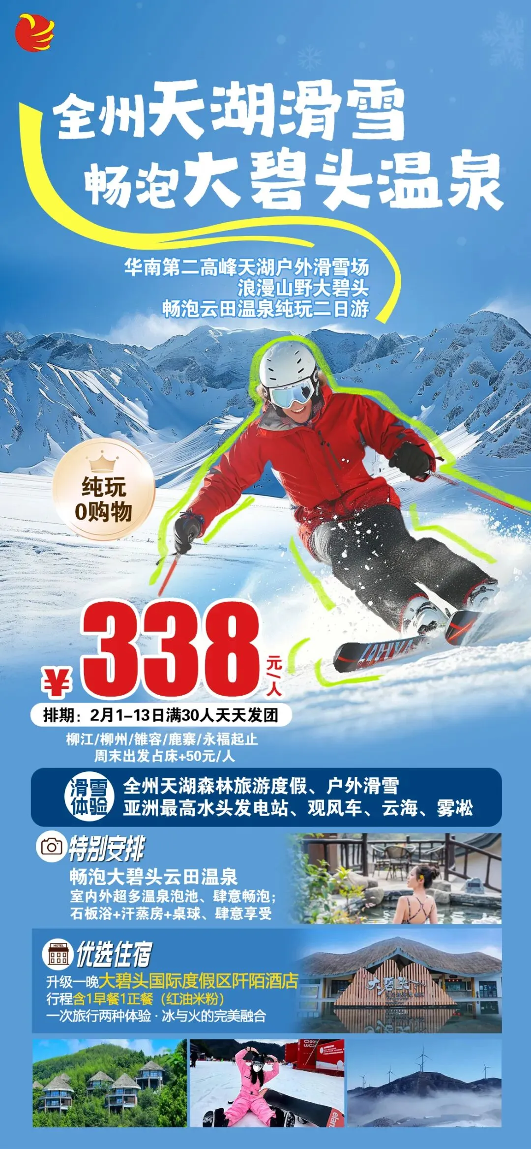 全州大碧头温泉,天湖滑雪纯玩二日游338元每人