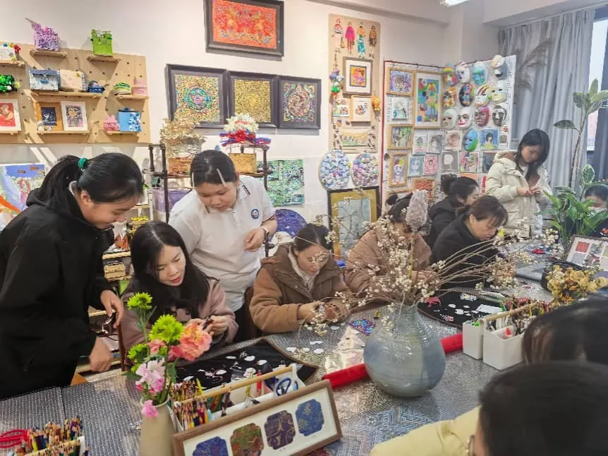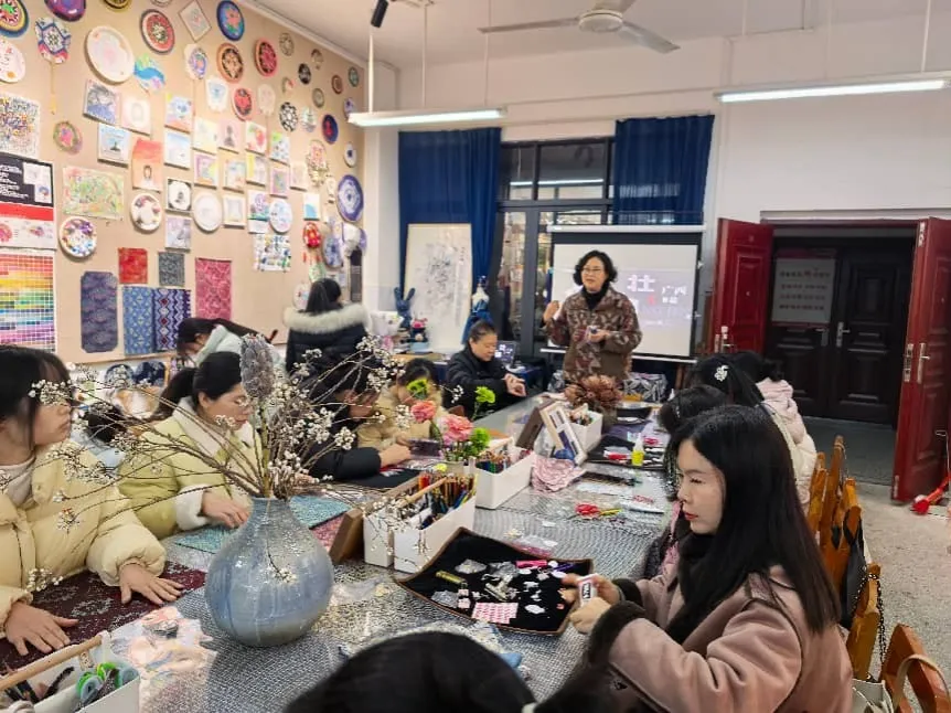 随后,身为柳州市普通高中历史学科课程基地核心成员、柳州三中正高级美术教师兼学科带头人的黄鹏同志,为两校教师呈上了一场精彩的壮锦文化专题研学讲座与实践指导。黄鹏老师以历史之眼,系统梳理了壮锦于岭南民族发展长河中的演变脉络、不同历史时期的艺术特质,以及纹样中潜藏的民族交往交流、生产生活变迁等历史信息,深刻阐释了壮锦作为地方历史文化载体的核心要义。结合历史教学基地的教学实践硕果,她细致分享了将壮锦这类非物质文化遗产转化为历史教学资源的具体路径——诸如通过 “纹样解码历史”“工艺还原民俗” 等特色教学活动,让抽象的地方历史知识变得鲜活可感。在实践指导环节,她围绕壮锦面料的历史选材变迁、传统色彩的文化意蕴、经典纹样的历史渊源等方面展开细致示范,将历史知识巧妙融入手工实践全过程,充分展现了历史教学基地的专业引领与深厚教学积淀。