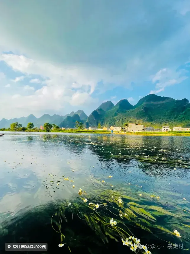 澄江是都安的母亲河,全长42公里。澄江源头是地下河天窗,从天窗涌出的水清澈透明,每年5月至10月河面上都会盛开美丽的海菜花,因而被称为会“开花的河”。