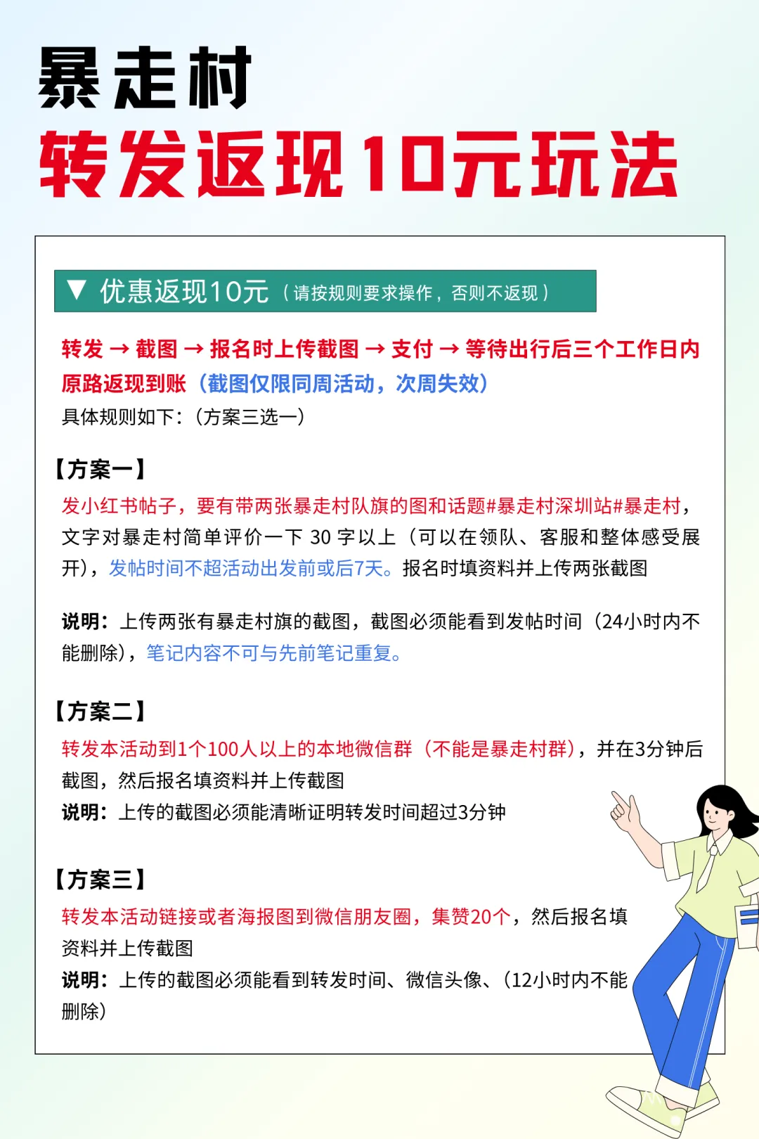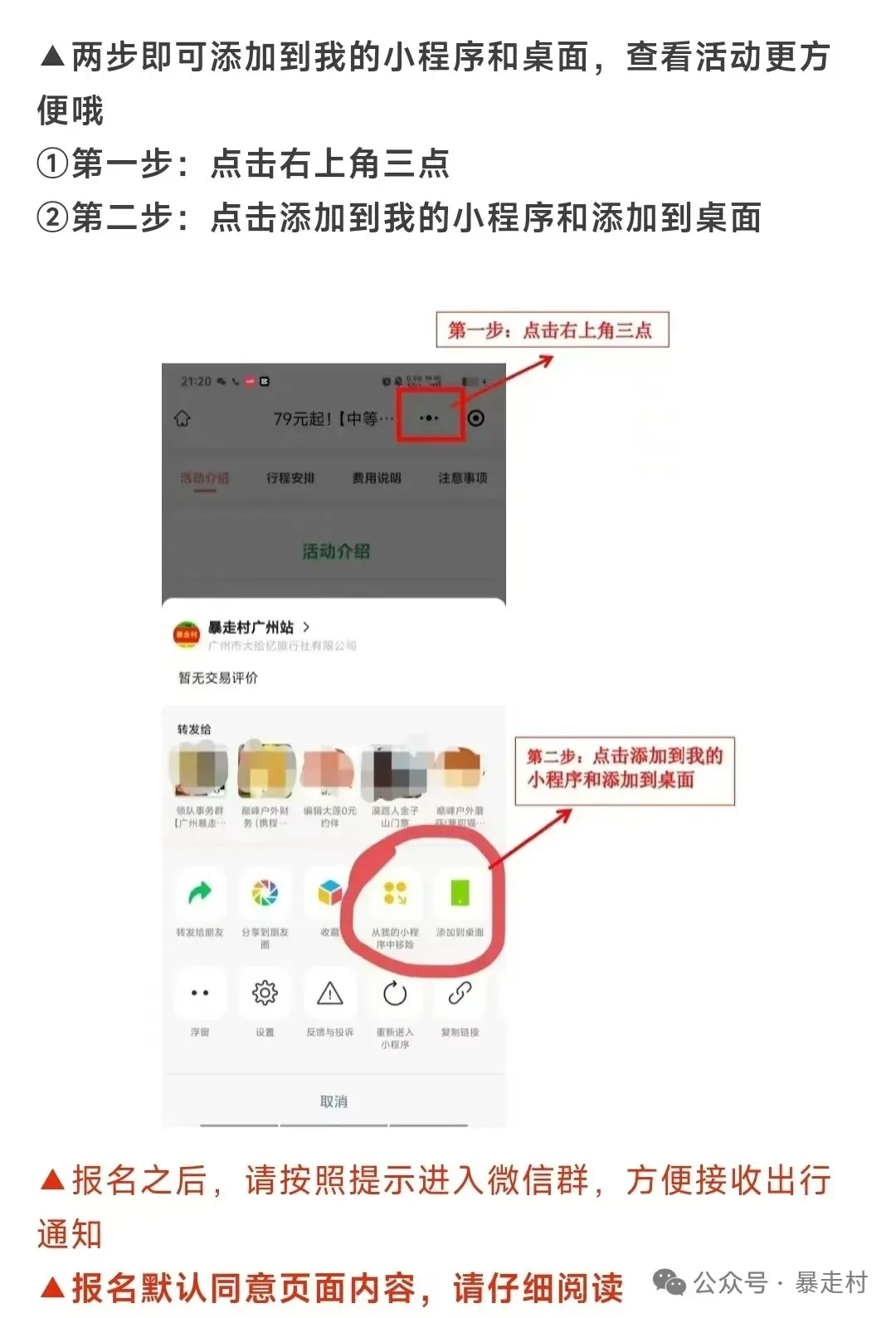 越早报名优惠越多多多,转发还可以享受返现(参看活动页面规则)转发 → 截图 → 报名上传 → 支付 → 等待出行当天原路返现到账10元方案一:转发本活动到100人以上的微信群(不能是暴走村群),并在3分钟后截图,然后报名填资料并上传截图方案二:转发本活动链接或者海报图到微信朋友圈,集赞20个,然后报名填资料并上传截图关注公众号,活动报名不迷路
