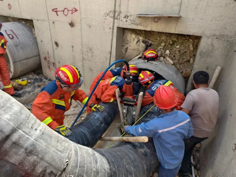消防救援人员抵达现场后发现,管道内径狭窄,仅容单人俯身作业,且空气流通不畅。因大型设备无法进入,指挥员立即制定专项救援方案。