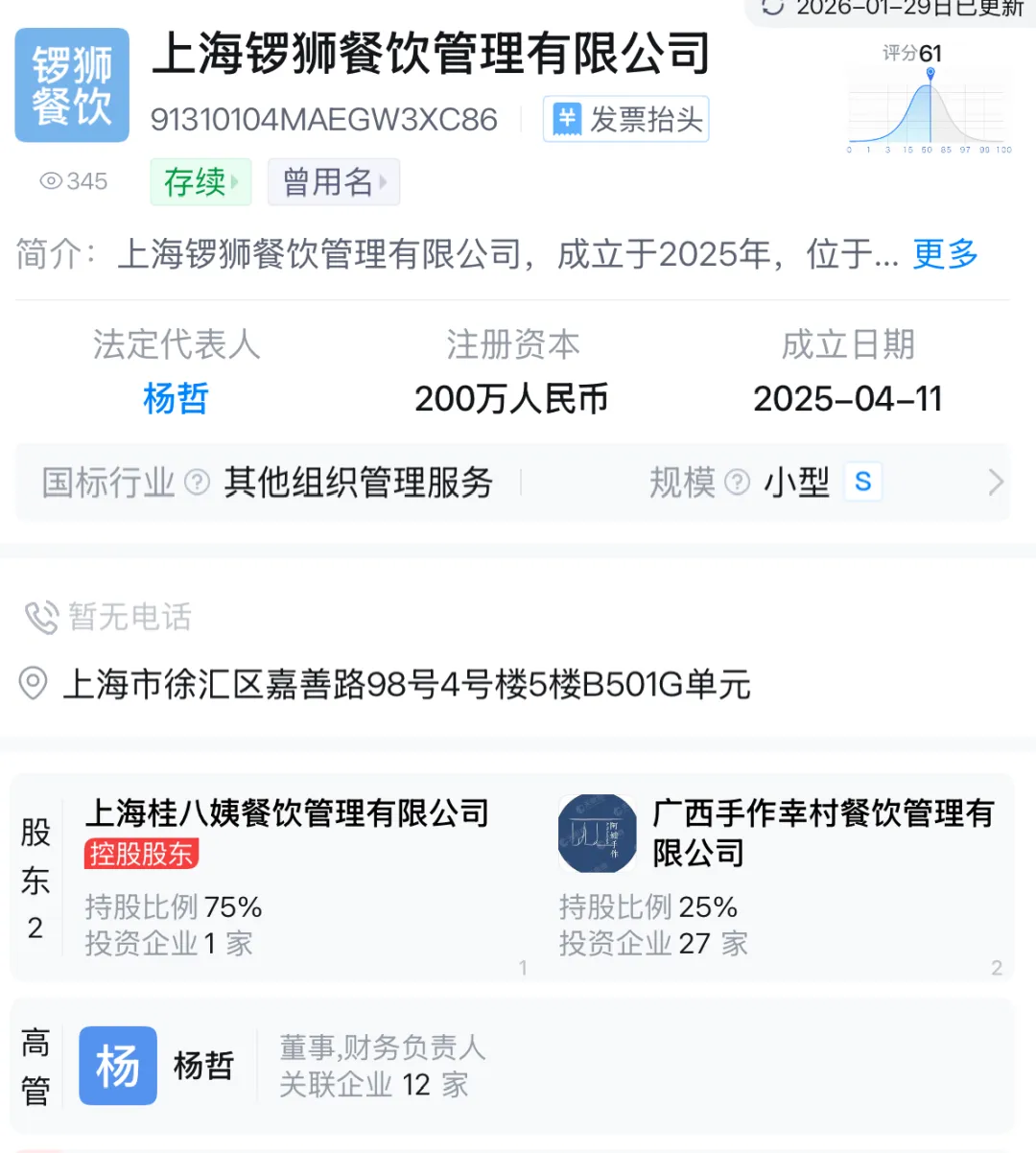 天眼查App显示,上海锣狮餐饮管理有限公司成立于2025年4月11日,注册资本200万元。该店由上海锣狮餐饮管理有限公司运营,阿嬷手作母公司——上海桂八姨餐饮管理有限公司持股75%,广西手作幸村餐饮管理有限公司持股25%。