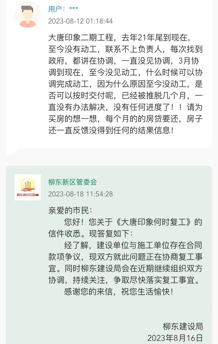 据柳东新区管委会的答复,二期停工是由于工程方与房开商之间存在一期工程款项纠纷,导致了二期停工,现阶段仍在协商中
