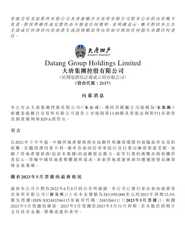 今年5月份,大唐地产发布公告称,未能按期支付一笔高达2.8亿美元的票据,以及到期说需要支付的利息。而这一笔债务,是一年以前,大唐成功展期的一笔美债,此次发公告,算是正式承认了自己债务违约。