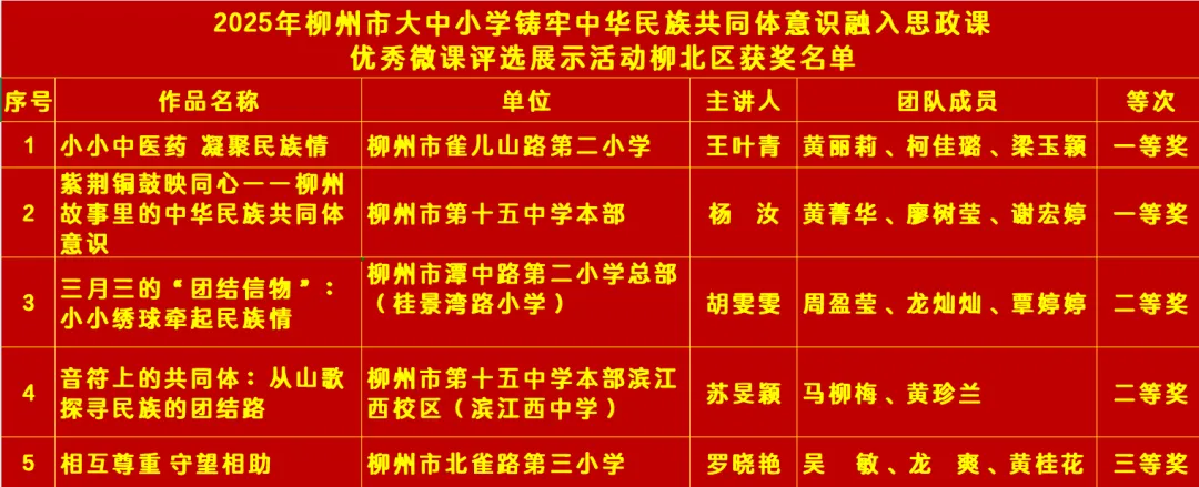 喜报!柳北区在2025年柳州市大中小学铸牢中华民族共同体意识融入思政课优秀微课评选展示活动中喜获佳绩