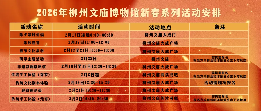 为丰富市民节日文化生活,营造欢乐祥和、喜庆热烈的新春氛围,柳州文庙博物馆将开展丰富多彩的文化惠民活动,邀您共赴新春文化盛宴!