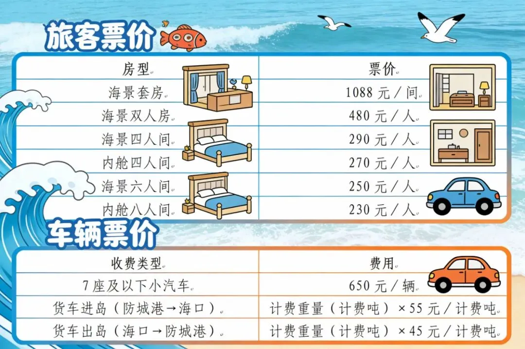 「万荣海」轮 &「棋子湾」轮票价完全统一,小车、货车、各类客舱票价标准一致,透明放心,怎么选都划算~