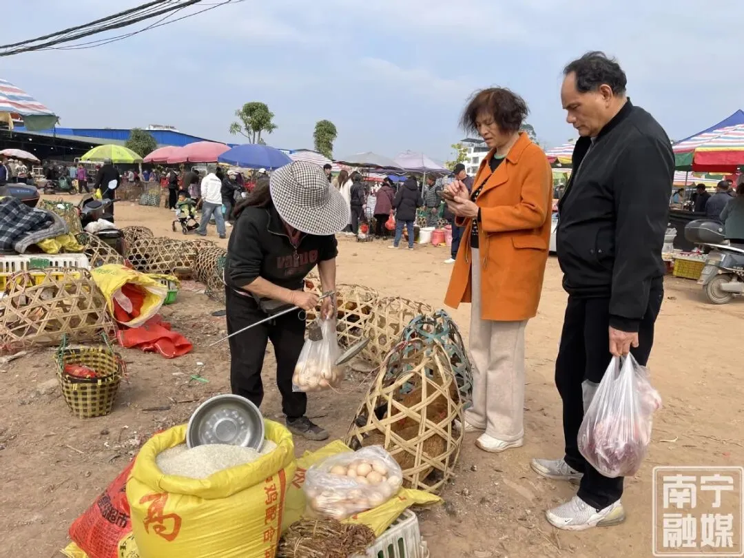 “那马圩的土货最是地道,价格还实惠!”在南宁,提起那马圩日,不少市民都赞不绝口。这座百年老圩藏着满满的“宝藏土货”,现摘的新鲜果蔬带着晨露,芝麻饼、米花糖等古早小吃勾起儿时回忆,土鸡土鸭、山野蜂蜜、野生药材一应俱全,比起市区菜市场,这里的农家味更浓、性价比更高。春节临近,赶圩采购成了市民的刚需,尤其是中老年市民,总爱拎着菜篮子、推着小推车来此选购,把新春的烟火气和幸福感装回家。