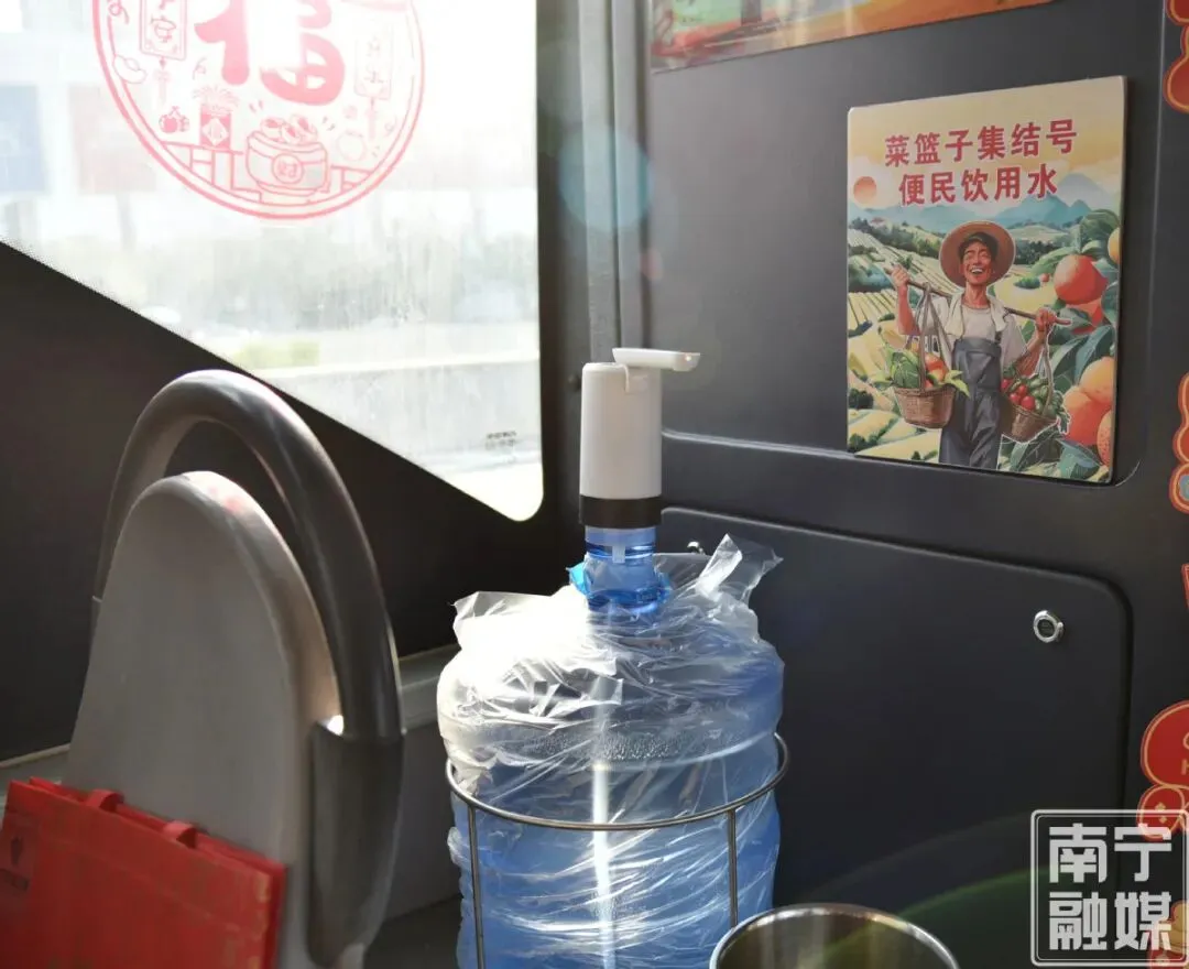 与普通公交车不同,这趟专线的车厢内加装了承重挂钩,方便悬挂采购物品,还配备了便民药箱、雨衣、扇子、购物袋等应急物品,并且还提供免费饮用水。为迎接春节,车窗上贴着精致的剪纸窗花,车厢前后还悬挂着寓意吉祥的新春对联,浓浓的年味让乘客们一上车就感受到节日的喜庆氛围。