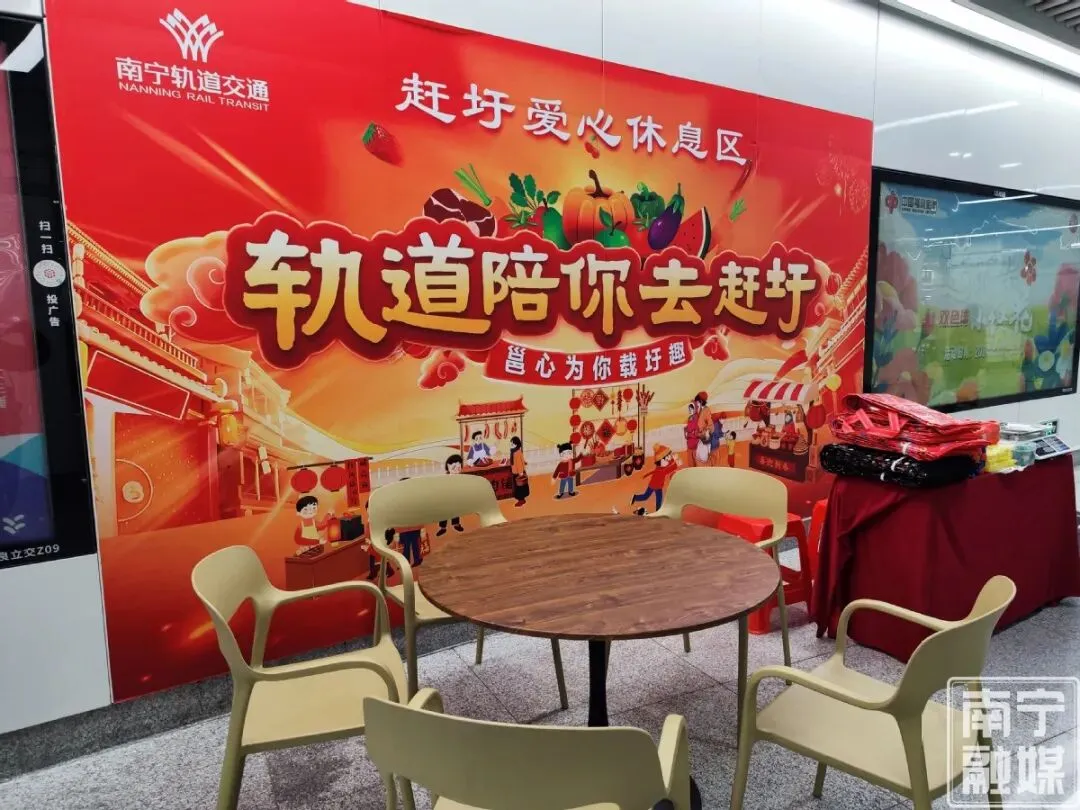 除了专线升级,南宁地铁还在福建园站、平良立交站等赶圩客流集中的地铁接驳点设立“赶圩爱心休息区”,休息区提供打包绳、小拖车、公平秤、购物袋等便民设施,还设置了现金兑零点、针线包等应急服务。