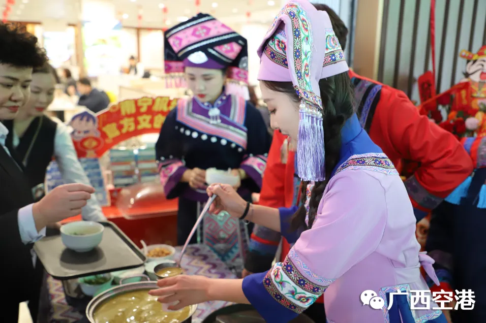 试业现场,壮族风情拉满!不仅有壮乡助农特色小吃免费试吃,还有身着传统服饰的工作人员,熬制油茶供旅客免费品尝。独具特色的民俗体验,搭配诚意满满的福利活动,吸引了众多旅客驻足打卡、进店消费。