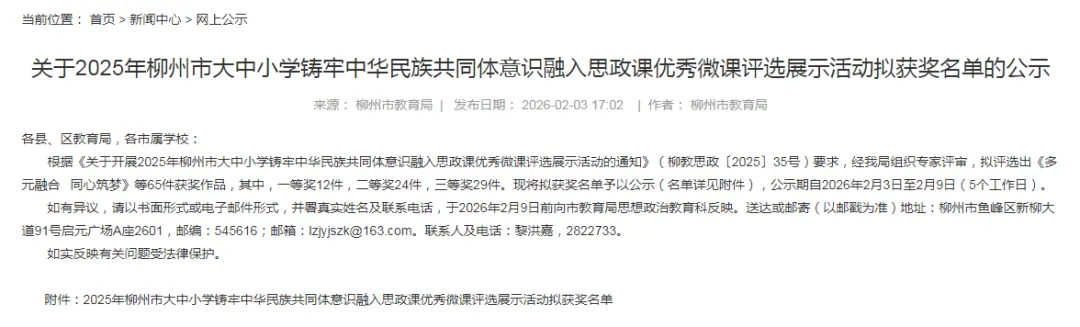 根据《关于开展2025年柳州市大中小学铸牢中华民族共同体意识融入思政课优秀微课评选展示活动的通知》(柳教思政〔2025〕35号)要求,经我局组织专家评审,拟评选出《多元融合  同心筑梦》等65件获奖作品,其中,一等奖12件,二等奖24件,三等奖29件。现将拟获奖名单予以公示(名单详见附件),公示期自2026年2月3日至2月9日(5个工作日)。
