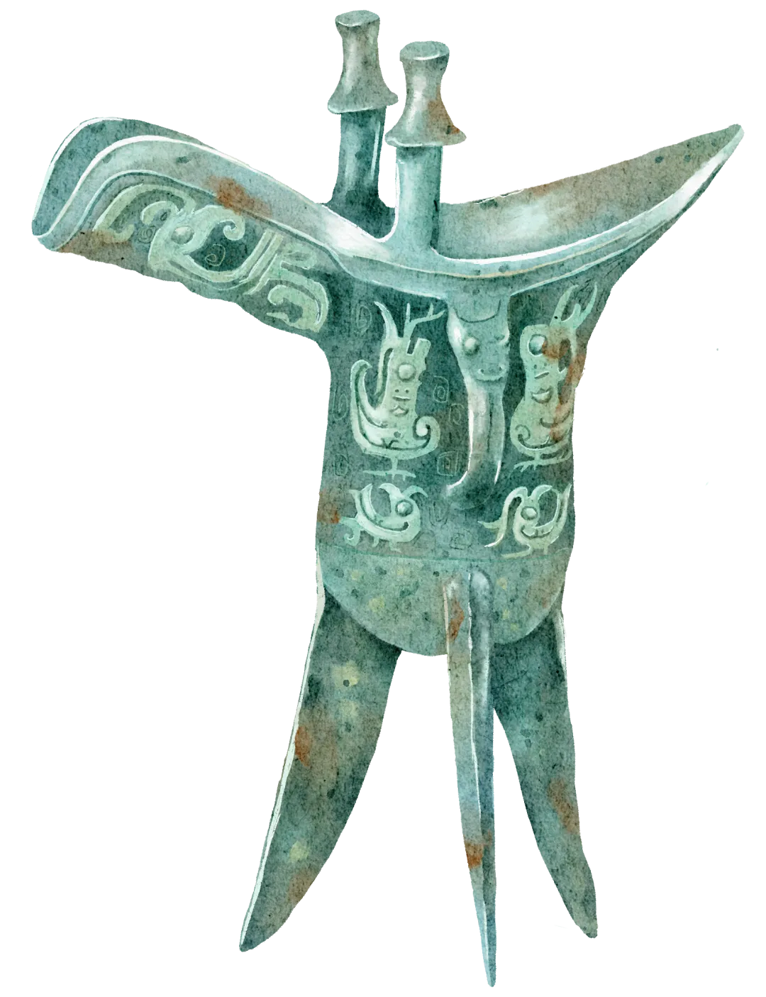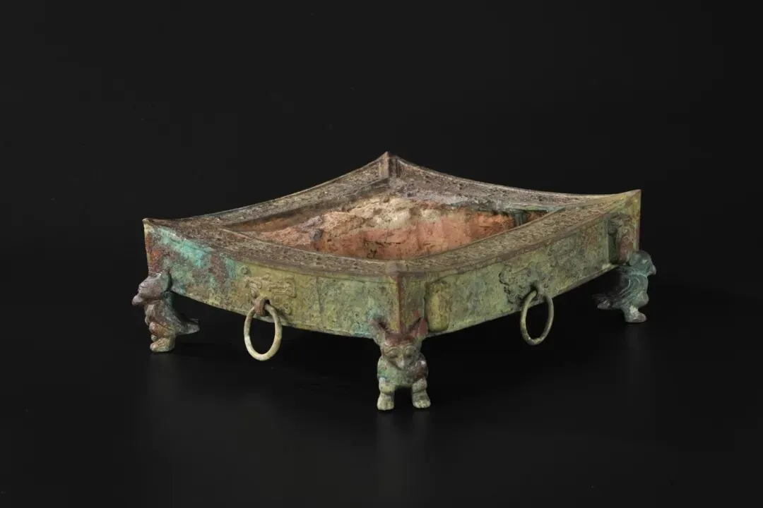 这是烧烤用具。平面近方形,四足为鸮形,鸮两足着地,脊背顶负炉盘。炉壁上铸有4只小猪,猪嘴朝天,用以插放烧烤用具。四壁有铺首环,便于穿上铁链提起烤炉。炉四角微翘,防止食物滑落,内底凹陷,便于放置炭火。烤炉在出土时还配备了用来插烧食物的铁钎、铁叉以及钩挂烤炉的铁链。