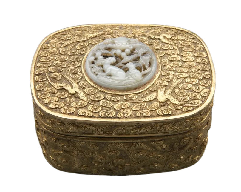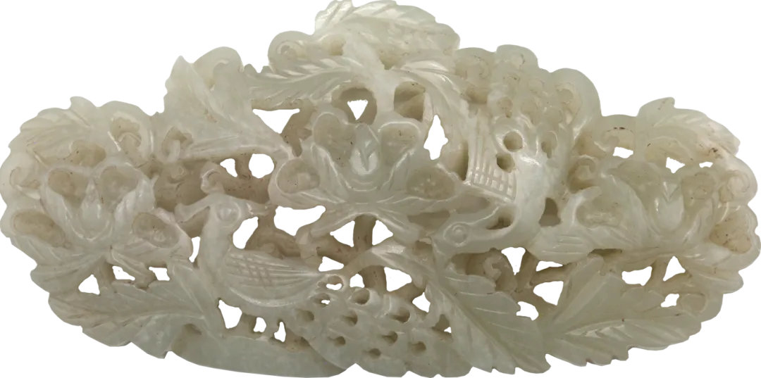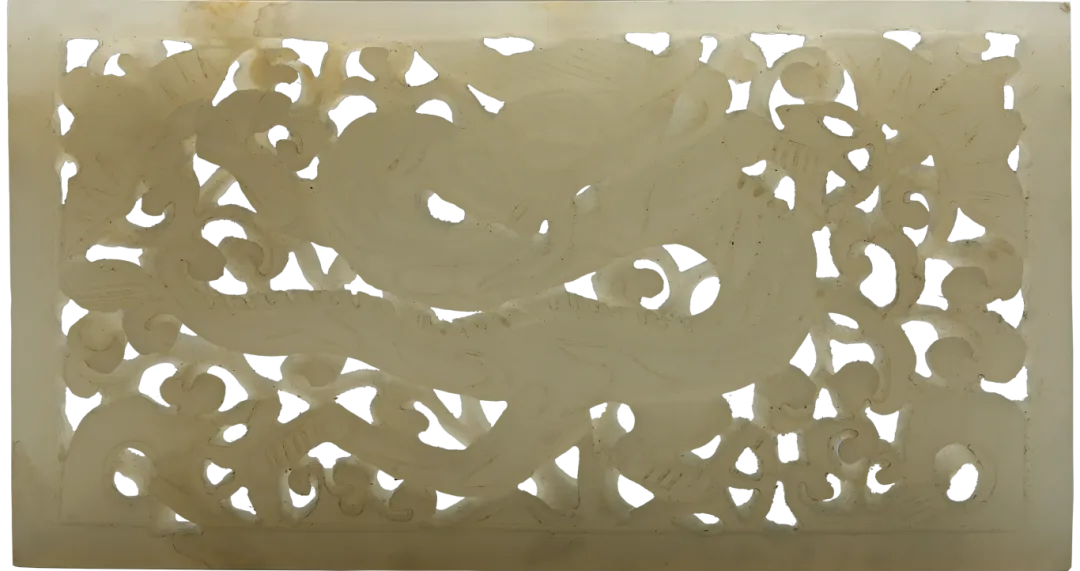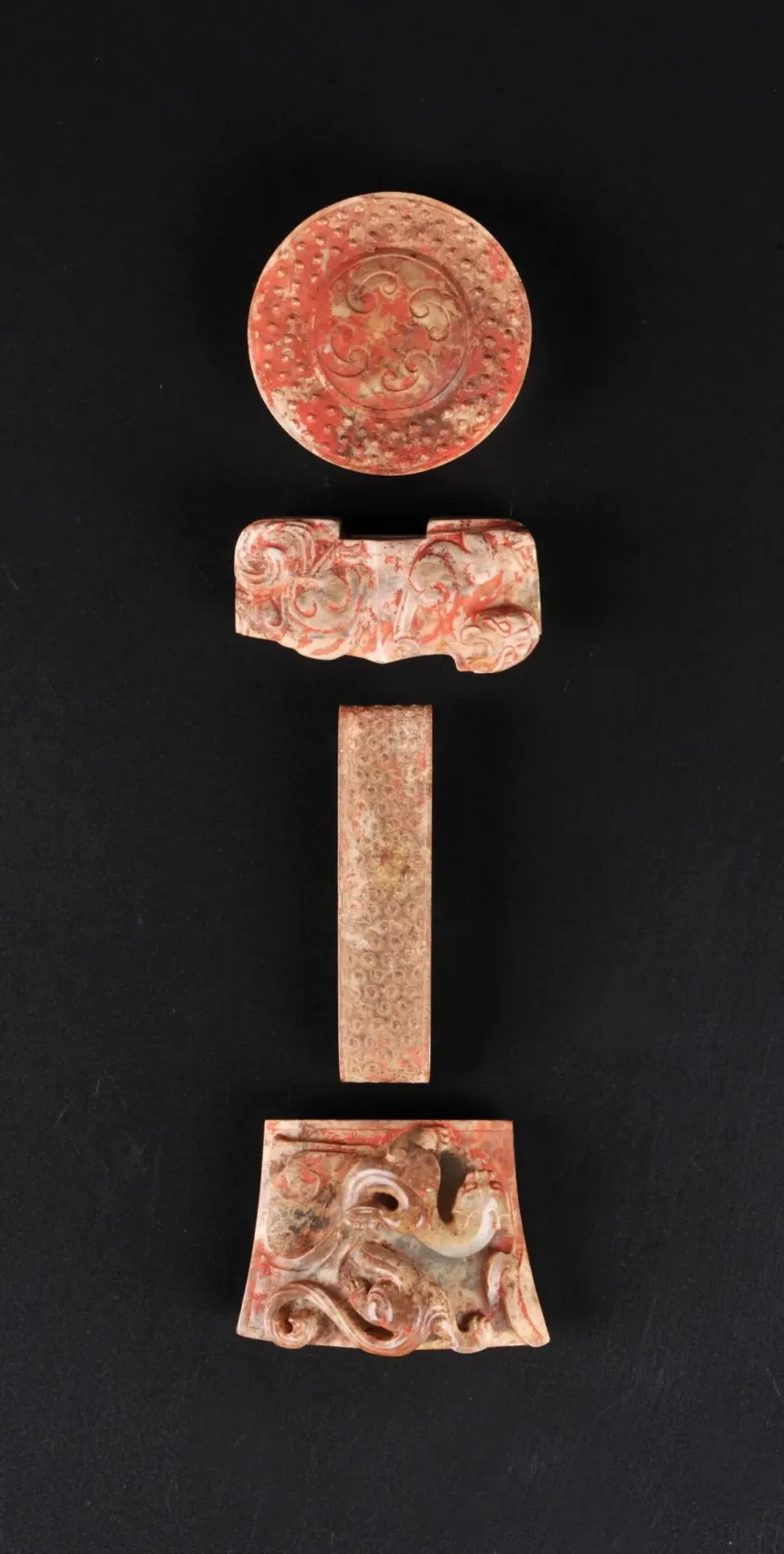 玉剑饰是装在剑柄和剑鞘上的玉饰,一般由剑把上的首、格和剑鞘上的璲、珌四件组成一套。南越王墓共出土58件玉剑饰,有8组成套,是汉代出土玉剑饰最多的墓葬,且纹饰华美、工艺精湛,堪称汉剑装饰艺术之冠。这套玉剑饰器型别致,做工精细。其中剑格器形浑厚,两面饰有一大一小浮雕螭虎;剑珌正面高浮雕一螭虎行于云间,动态十足。