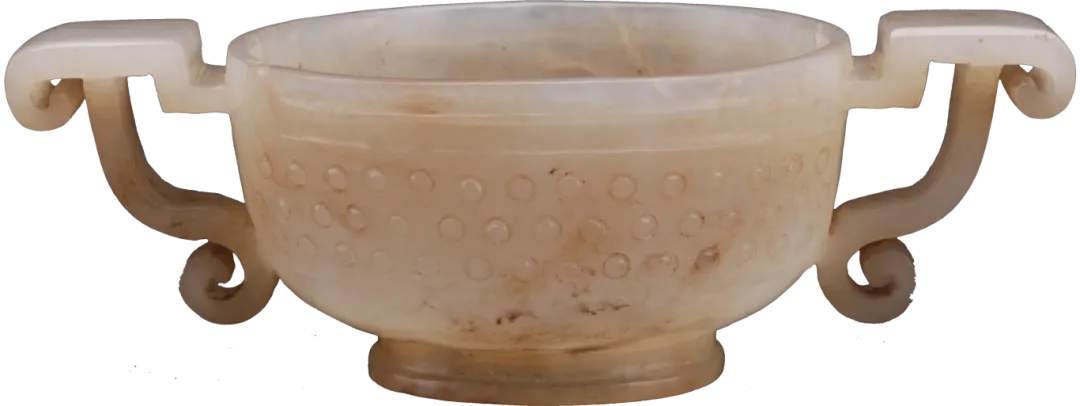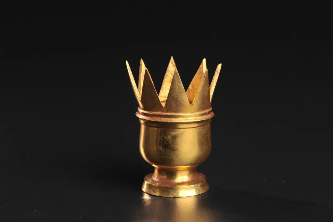 漆杯的器座。外形似杯,上有锯齿形口沿,口沿处还残留有漆皮。这种漆杯金器座在其他地方未曾发现,大概可认定为南越国所制。