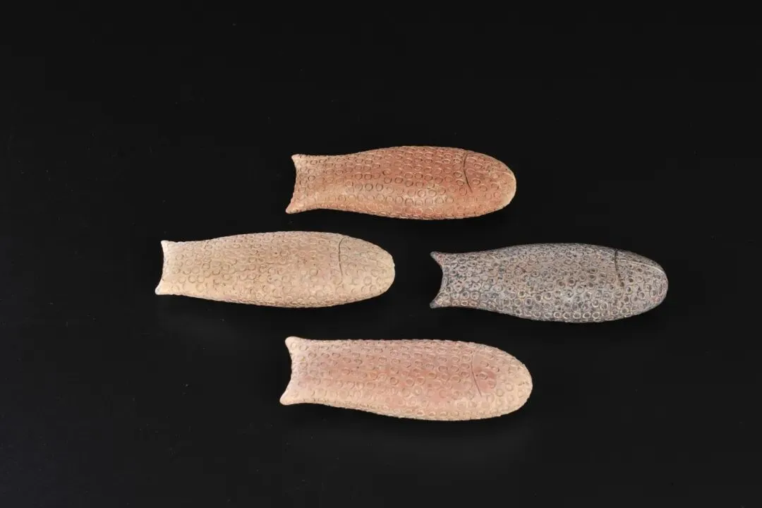 南越王墓出土了9件,为空心鱼形,戳印或划刻出眼、嘴、鳃盖和鱼鳞,应为南越国烧造的几何印纹陶。内装粗砂粒,摇动可发出响声,作用与陶响器类似。