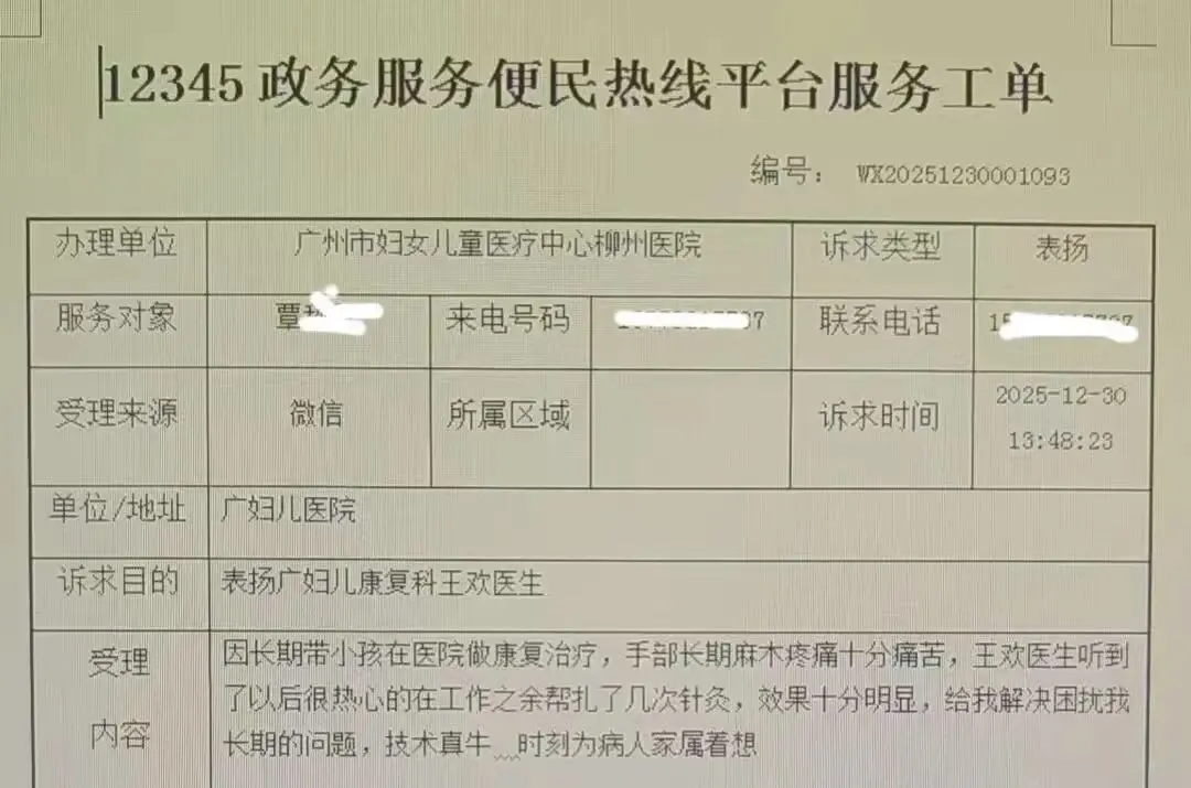 12345政务服务热线的工单,是患者家属无声的锦旗。覃女士在表扬工单中写道,王欢医生利用工作之余为她扎针治疗,耐心调整方案,逐步缓解了她长期手部麻木疼痛的困扰,帮她重拾舒适生活。