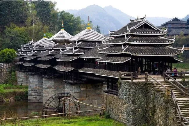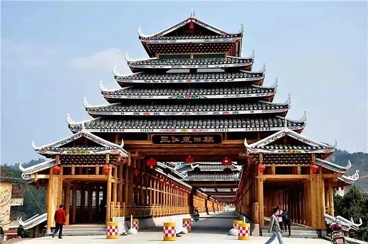 【程阳风雨桥】:世界四大历史名桥之一;《三江风雨桥》位于广西柳州三江侗族自治县浔江河上,由钢筋混凝土月牙形单桥拱和集侗族特色木结构建筑技艺精华于一体,有7个桥亭,其长度和规模均为世界之最,堪称世界第一风雨桥。
