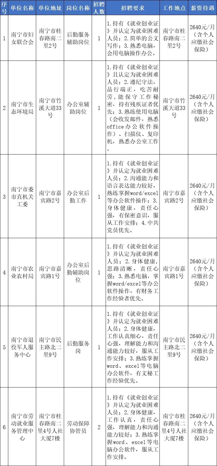第一步:公开发布招聘岗位信息。人社部门每月向用人单位收集岗位信息并通过南宁市人力资源和社会保障局网站(http://rsj.nanning.gov.cn/)、南宁人社微信公众号等方式向社会公开发布公益性岗位信息及专场招聘会时间;