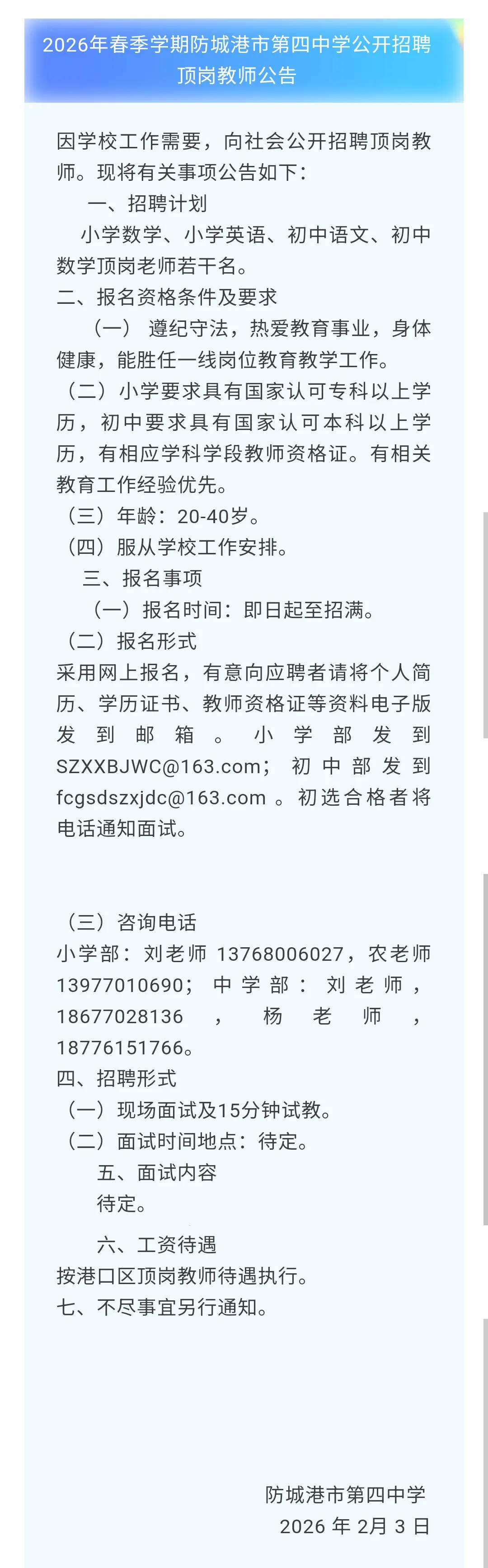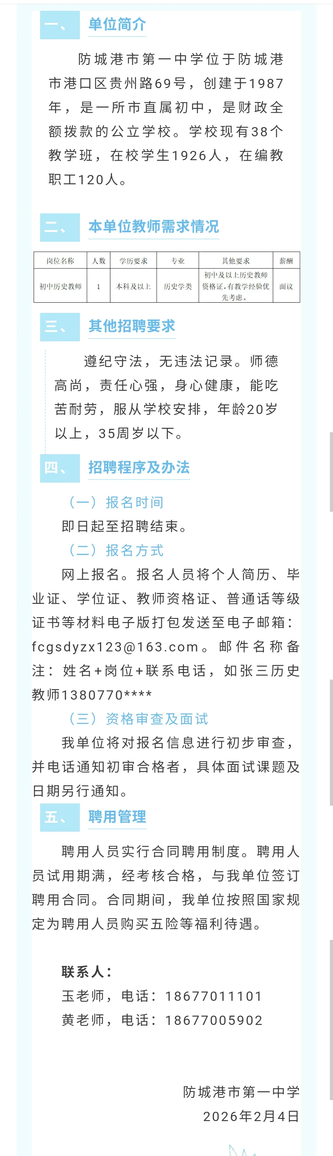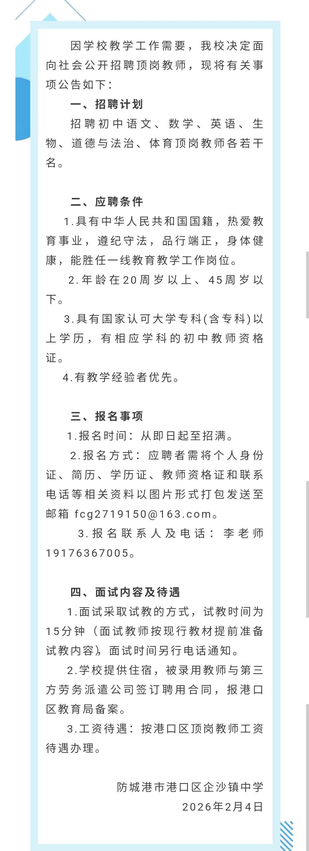 防城港教师招聘:防城港市港口区企沙镇中学招聘
