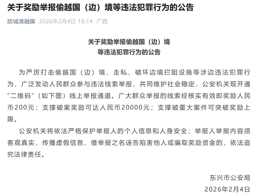 2月4日,东兴市公安局发布《关于奖励举报偷越国(边)境等违法犯罪行为的公告》,具体内容如下: