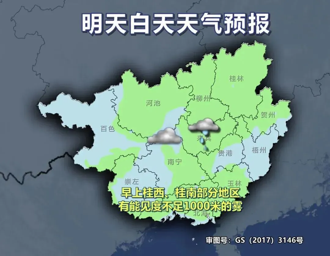 明天白天,全区阴天间多云大部有小雨。早上桂西、桂南部分地区有能见度不足1000米的雾。