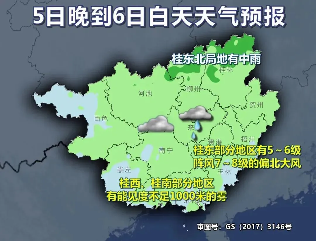 5日晚上到6日白天,全区阴天有小雨,其中桂东北局地有中雨。桂东部分地区有5~6级、阵风7~8级的偏北大风。桂西、桂南部分地区有能见度不足1000米的雾。最低气温:高寒山区2~8℃,桂东北9~14℃,其它地区13~19℃。