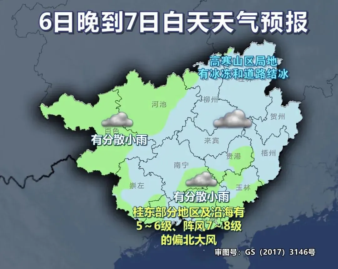 6日晚上到7日白天,桂西、桂南阴天有分散小雨,其它地区阴天。高寒山区局地有冰冻和道路结冰。桂东部分地区及沿海有5~6级、阵风7~8级的偏北大风。最低气温:高寒山区-2~4℃,桂东北5~11℃,其它地区11~16℃。(来源:南宁气象、广西天气)